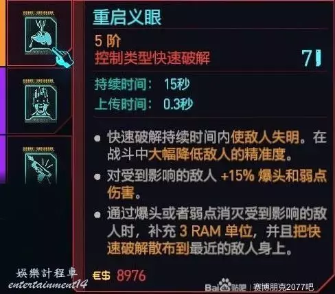 至於同樣在四階出現的終極類型破解,我只能說,花裡胡哨,意義不明。賽博精神病日常打不死人,自我了斷只能打骷髏怪半管血,甚至不如武器故障,畢竟武器故障的炸毀武器也能造成不少傷害。只有系統崩潰還有點用,但在戰鬥中有時會出現被崩潰的敵人原地復活的bug,建議不要太依賴它,潛行的時候用用就好。