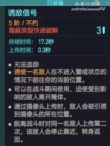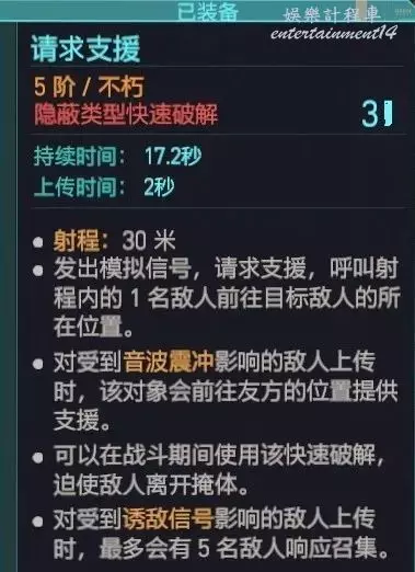 效果類似請求支持但更好用一些。潛行狀態可以把敵人引至攝像頭,或者連續兩次使用以獲得鉗制的機會。戰鬥中也可以讓敵人從掩體後面出來。對於喜歡脖子右擰的駭客可以考慮帶上。