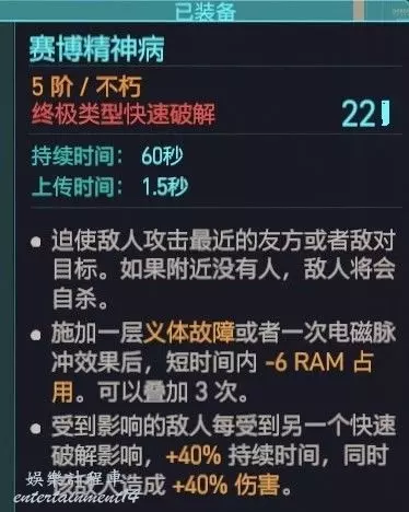 大家都愛的賽博蛐蛐,不過娛樂意義大於實戰。終極類破解的特點是可以通過特定手段減費,而賽博精神病的觸發是最低效的,需要對“同一個”敵人使用3次義體故障,導致實際上根本沒減多少費用。而且值得使用賽博精神病的高強度精英都有極高的抗性,根本用不出來。不過,看著敵人自相殘殺也的確是一件樂事。