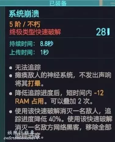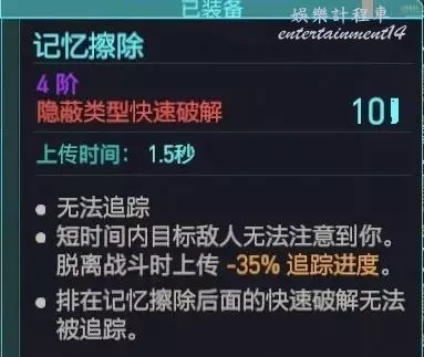 潛行專用破解,核心效果是在擦除之後上傳的“所有”破解均不可被追蹤,不出追蹤條的那種。而有追蹤條的情況下,擦除還可以-35%進度,可謂是一切效果都是為了潛行。缺點是RAM消耗略高,而且需要配合其他戰鬥破解使用,需要腦機超頻的支持。