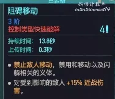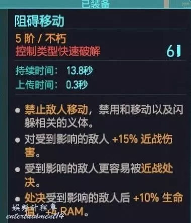 非常強大的控制破解,真正意義上的“控制”。阻礙移動能把敵人定在原地,並禁用閃避能力。除了徹底廢掉近戰能力之外,不能動的敵人還是個很好的靶子,能顯著提高命中和爆頭率。而面對大量的敵人,多個阻礙能把敵人分割,創造一對一的局面。而詞條增加的近戰傷害加成、處決血線提高和處決後回血回藍,對於近戰駭客來說都是非常有價值的。不玩近戰,單純需求控制能力的話,可以選擇RAM消耗更低的藍色阻礙。