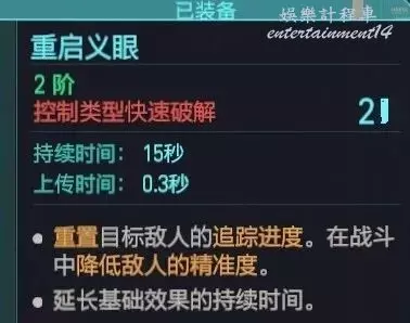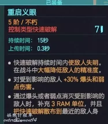 讓敵人失明,這是一個很微妙的效果。失明能減慢敵人發現你的時間、能減少遠端敵人的命中,能阻止敵人衝刺,雖然不是硬控但勝在適用範圍廣。不過重啟義眼更重要的作用是+30%爆頭傷害,對所有需要爆頭的流派(智慧型武器和鎮靜系武器)都能提供不少輸出。爆頭擊殺傳染並回藍的方便功能更是能免於頻繁開掃描並剩下大量RAM。