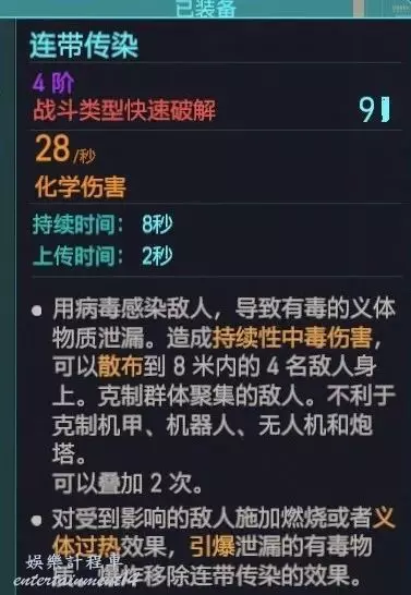唯一一個群體傷害破解,但傷害不是靠破解本身。連帶傳染本身的傷害非常低,它的意義來自於燃燒效果造成的爆炸。這個爆炸傷害極高能直接秒掉普通敵人,精英敵人也挨不過兩次,聚團的敵人連續引爆可以瞬間清場,是駭客最高效的群攻手段。引發毒爆效果需要任意手段點燃敵人,通常使用火焰手雷或高攻擊頻率帶點燃幾率的武器,比如詩篇、原型信玄甚至補牢。毒爆也能疊加玩火自焚,提高駭客的生存能力。