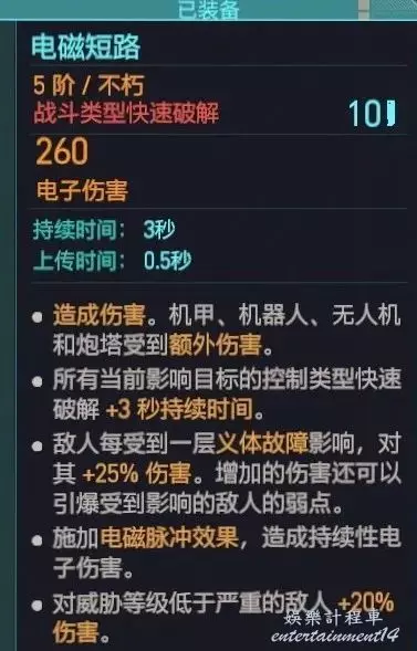 性價比和通用性最高的戰鬥破解,傳統駭客經典的輸出手段。高傷害、機械增傷、引爆弱點、持續傷害、增加控制破解持續時間,電磁短路的作用可謂全能,和義體故障聯用能一個佇列秒殺任何非boss敵人(沒有頂部血條)。