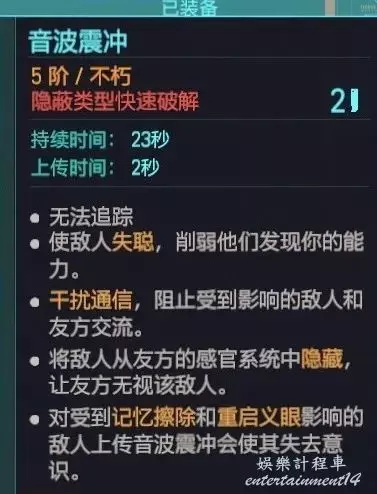 雖然詞條說的很玄乎,但實際作用就兩個。第一,把被影響者“隔離開”,通常配合連發消音武器暗殺,不會連帶使周圍的敵人進入戰鬥。第二,對同一對象先上傳記憶擦除+重啟義眼,在上傳音波會直接秒殺,效果視為系統崩潰。如果為了第二個效果,觸發這個效果與擦除及義眼的等級無關,所以通常配合RAM消耗最低的藍色擦除和綠色義眼。