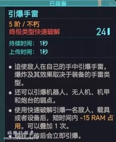 終極破解之恥,完全對不起“終極”之名。雖然引爆手雷也是一個可自我觸發的破解,連續使用可以持續減費到9RAM,但是它有兩個大問題。第一,不是所有敵人都有手雷,而對於沒有手雷的敵人這個破解完全無用。第二,傷害實在是太低了,別說精英連普通敵人都不能一擊必殺,這還叫終極嗎?
