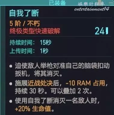 有用但不好用,這大概就是最適合的評價。自我了斷需要近戰處決減費,所以需要配合近戰武器使用。但近戰駭客相較於時停和狂暴系統,需要更多的技術,並不是一種主流流派(但並不是不強)。更重要的問題是,自我了斷的傷害不能擊殺滿血精英。所以這個破解的用途僅限於在近戰處決兩次後,點殺遠處的普通敵人用來回血,而這個用法其實會破壞近戰的節奏。