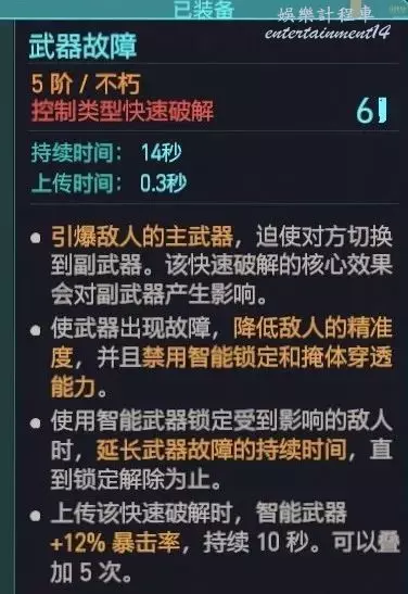 和阻礙移動相對,武器故障是完全針對遠端敵人的控制破解。武器故障不僅能明顯降低武器射速,還能禁用智慧追蹤和技術穿牆,甚至還帶了一點傷害(不算爆炸)。這個破解能廢掉敵人的遠端攻擊能力,甚至配合智慧型武器能持續作用。反過來,武器故障對近戰敵人毫無用處,甚至敵人沒有槍械都不能上傳。增加智慧型武器暴擊率倒是比較微妙,強勢的智慧型武器很容易滿爆,要是改成暴擊傷害就好了。