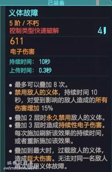 身是控制,心系戰鬥。義體故障的控制效果主要針對駭客,兩層就能徹底廢掉對面。不過義體故障的的主要價值在極其強大的傷害增加效果,+15%全種類傷害,不管是後續破解還是各種武器都能受到影響,並且和電磁短路還有進一步的聯動。疊加3層的持續傷害在boss戰中也是一種傷害的補充。8層的大傷害反而實戰意義有限,因為需要至少兩個佇列,而且後續難以繼續延長作用時間,反而喪失了增傷的作用。