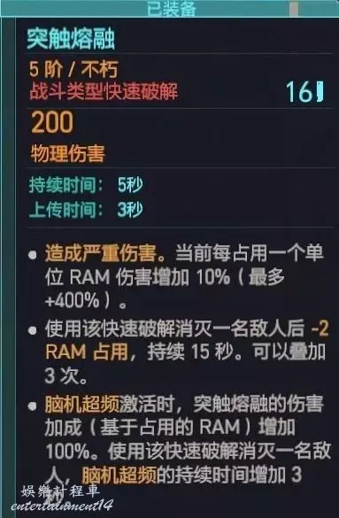 最頂級的戰鬥破解,駭客的核彈,單發輸出最高的手段沒有之一。想要體驗一發五位數的傷害嗎?來用突觸吧,但比起電磁短路來說需要投入更多資源。要最大化突觸的傷害,需要把RAM最大值盡可能堆高(收益上限為40),而且必須開啟腦機超頻並且空藍的狀態下才能打出最大傷害。同時因為突觸有擊殺延長超頻的詞條,所以保證回血能力就能無限使用。