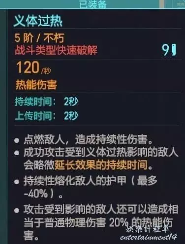 低調但有效。在駭客等級較低的時期,過熱是輸出最高的破解,一發即可消滅普通敵人。而在駭客成型後,過熱轉為輔助,各個詞條都說明這是一個需要配合武器輸出的破解。本身傷害不俗、+20%熱能增傷、-40%護甲,過熱在boss戰中大放異彩,能把任何堅不可摧的敵人變成破窗戶紙。而且持續性傷害和亮瞎眼的燃燒效果能把那些愛隱身的敵人(說的就是你,小田)標記出來,讓他們無處藏身。
