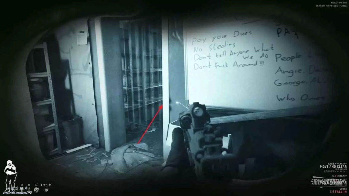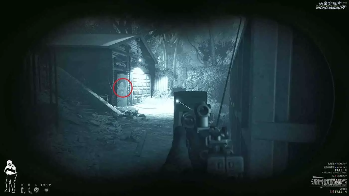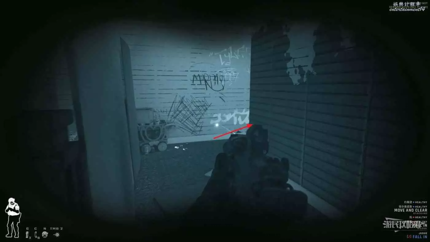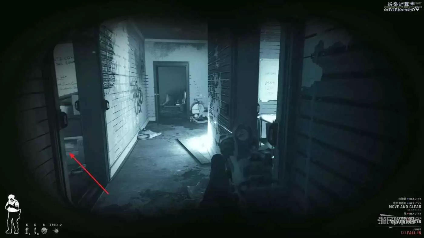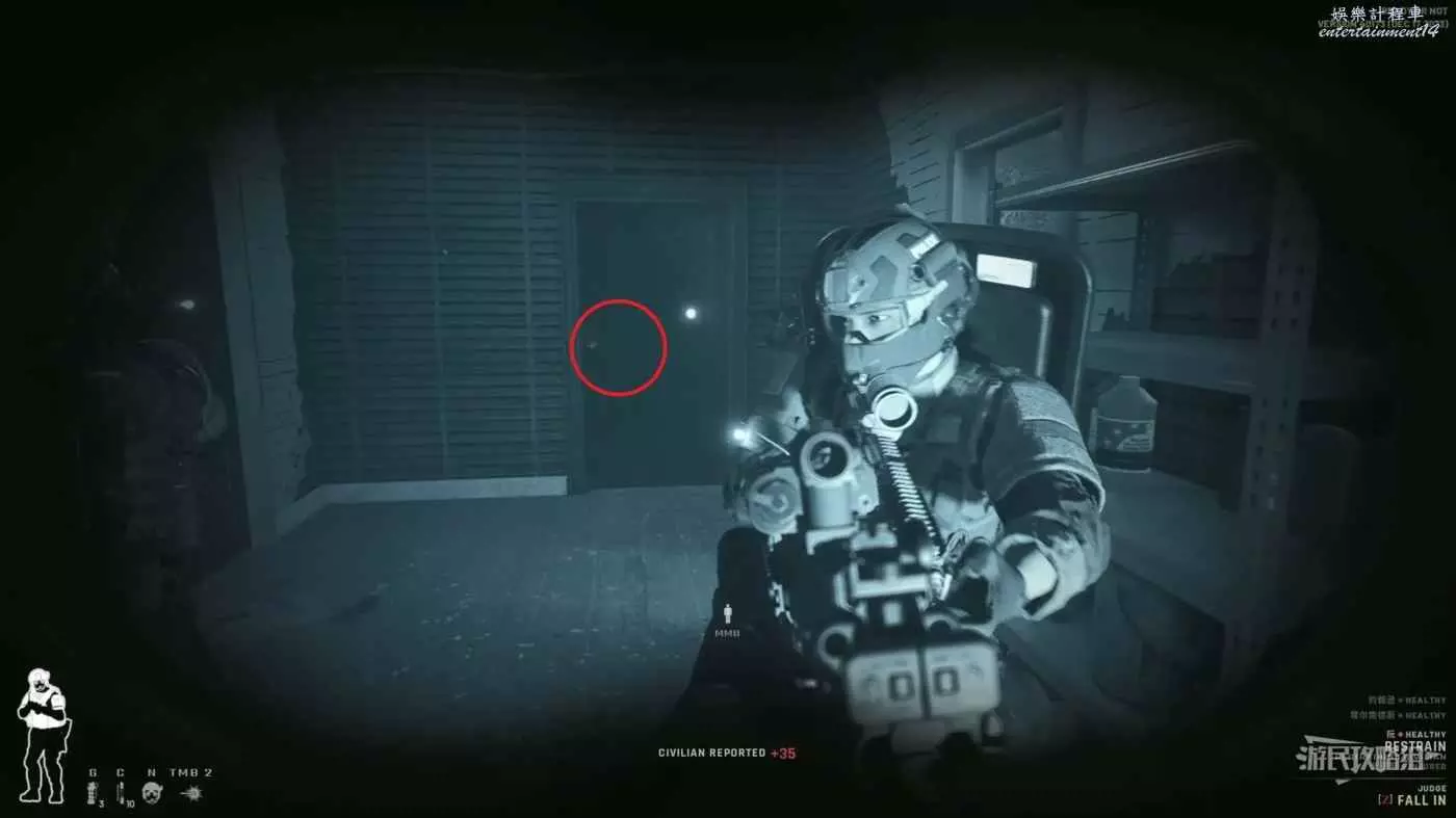 使用鏡槍觀察白色雙開門內的情況,可以看到門內已經有敵人開始警戒,這時最好的辦法是使用C2炸彈直接將門炸開,並逮捕懵掉的敵人。
