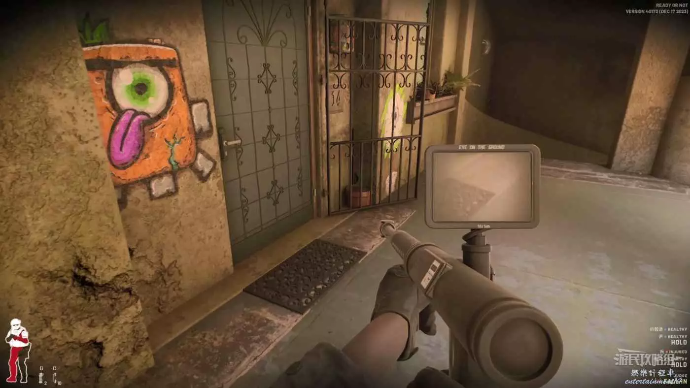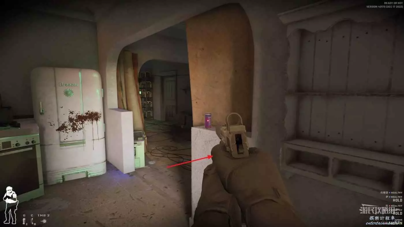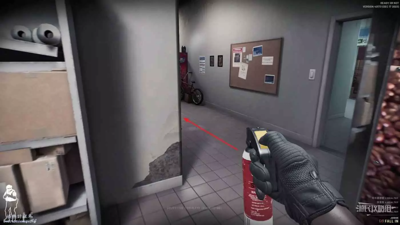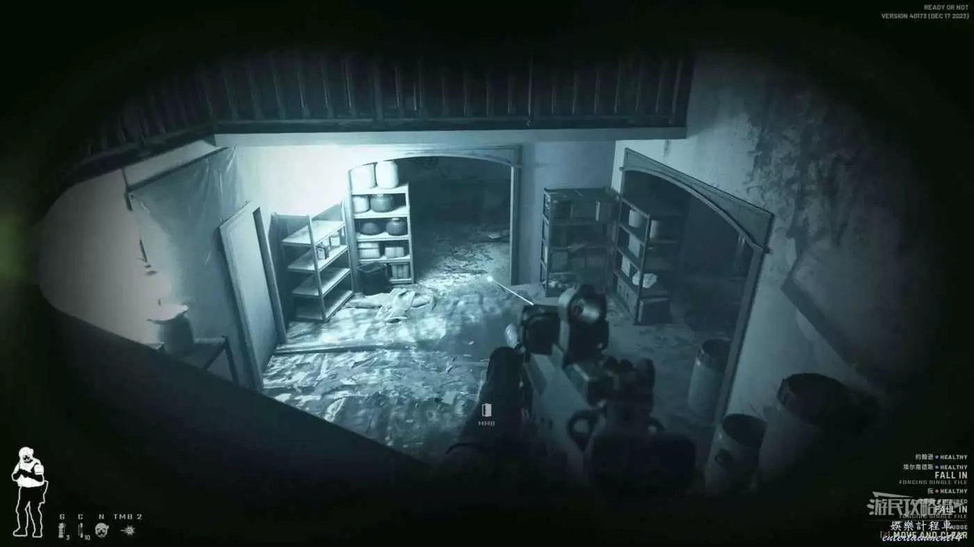 使用鏡槍觀察白色雙開門內的情況,可以看到門內已經有敵人開始警戒,這時最好的辦法是使用C2炸彈直接將門炸開,並逮捕懵掉的敵人。
