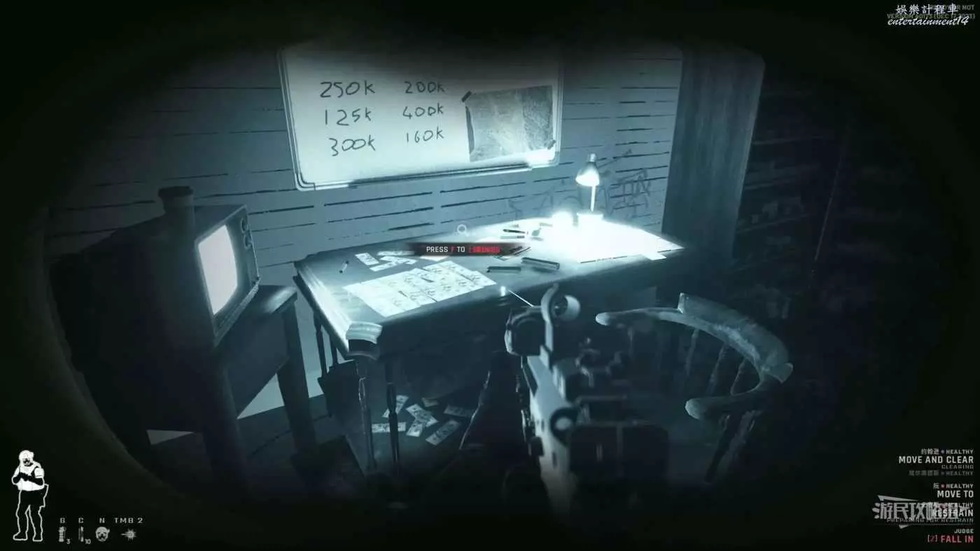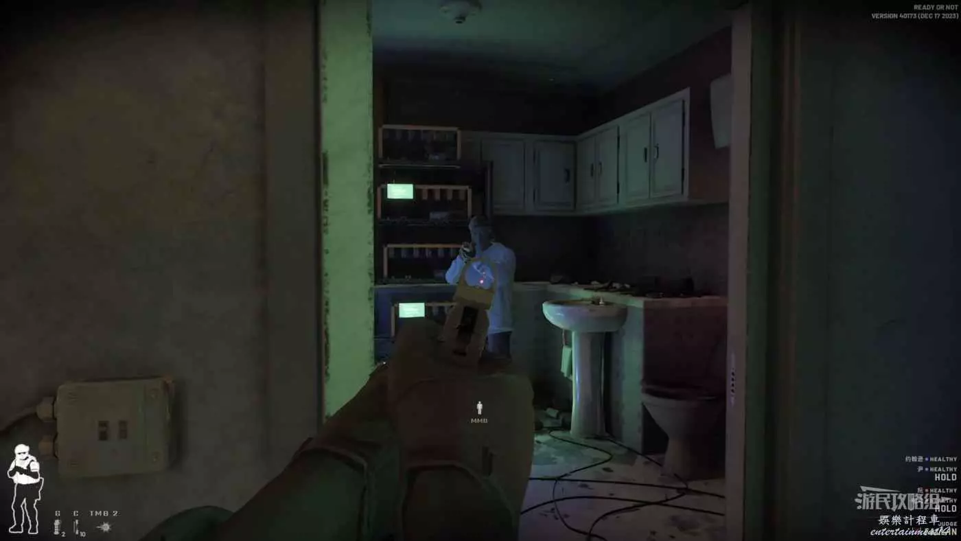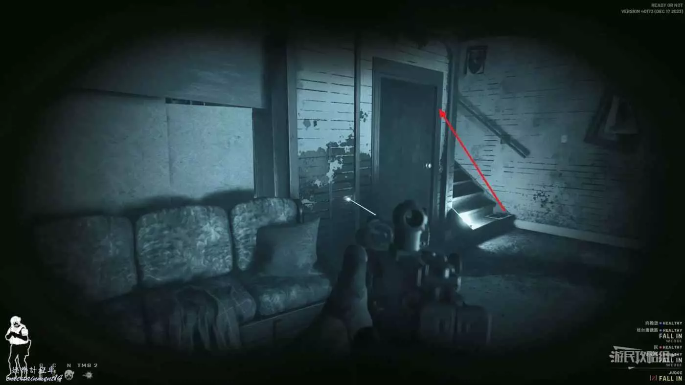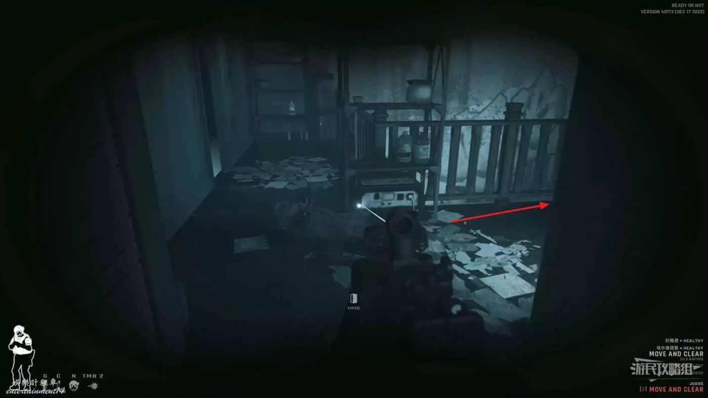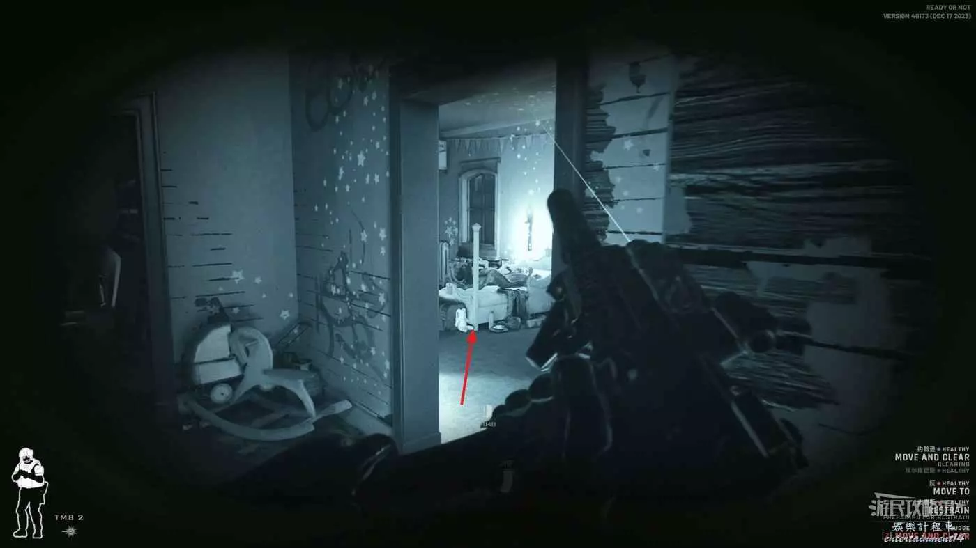 使用鏡槍觀察白色雙開門內的情況,可以看到門內已經有敵人開始警戒,這時最好的辦法是使用C2炸彈直接將門炸開,並逮捕懵掉的敵人。