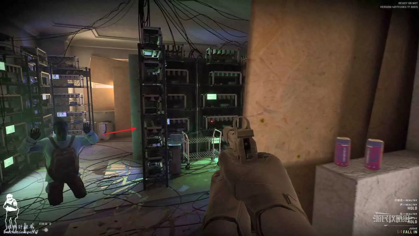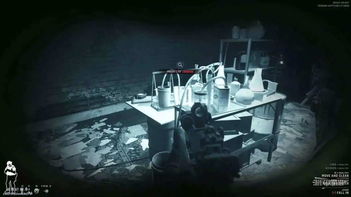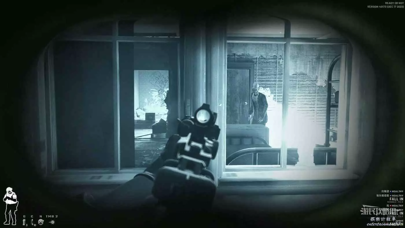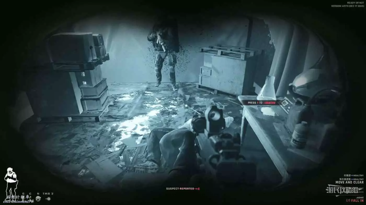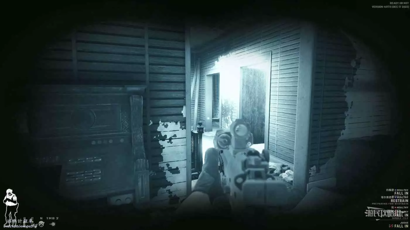 使用鏡槍觀察白色雙開門內的情況,可以看到門內已經有敵人開始警戒,這時最好的辦法是使用C2炸彈直接將門炸開,並逮捕懵掉的敵人。