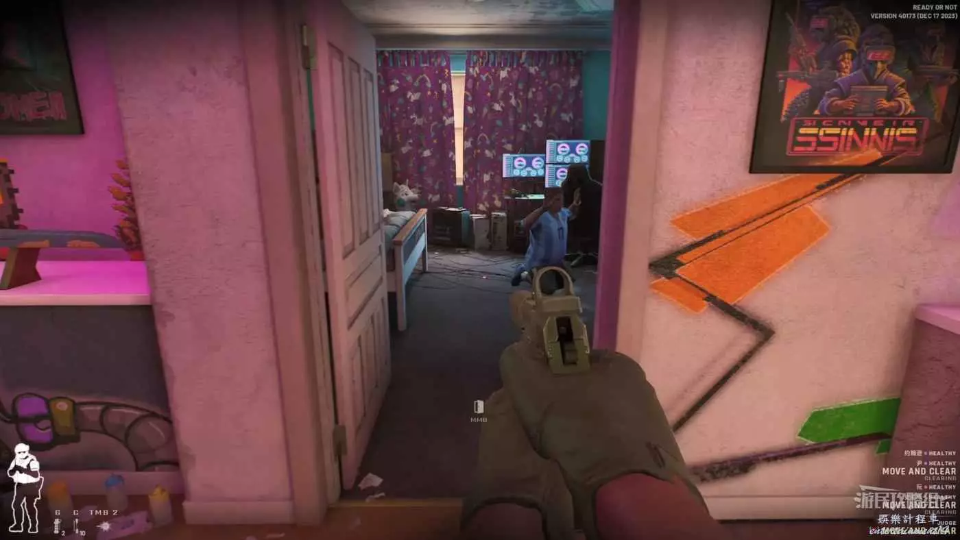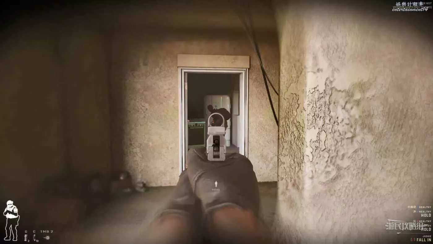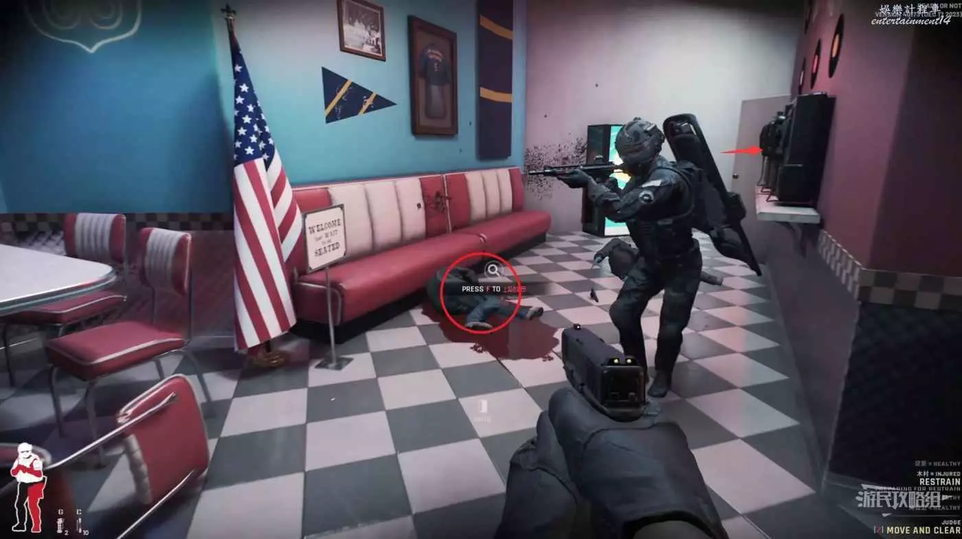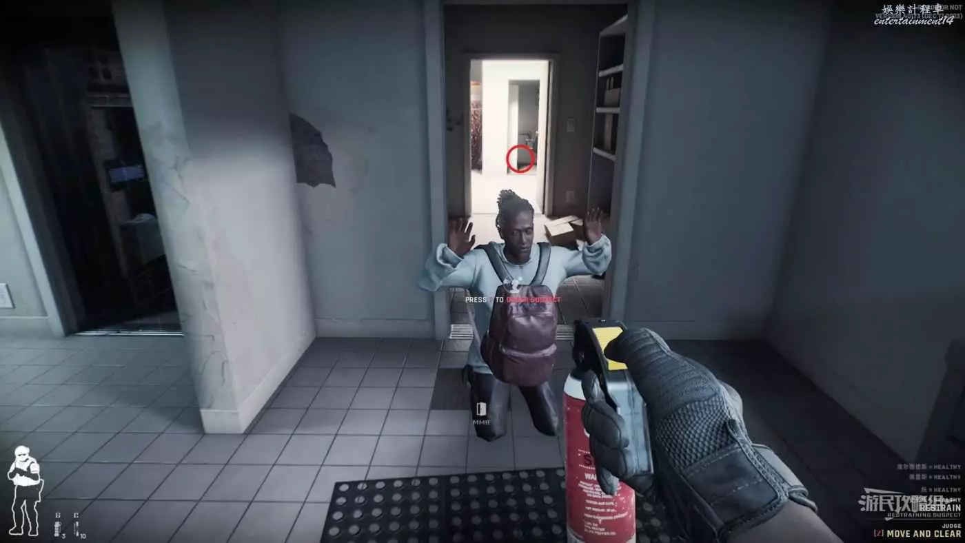 進入房間後優先搜索1樓左邊走廊的房間,這裡最靠外的右門刷出敵人的幾率較小,而右邊的裡門是與左邊的裡門相同的,刷出人質或敵人的幾率很高。