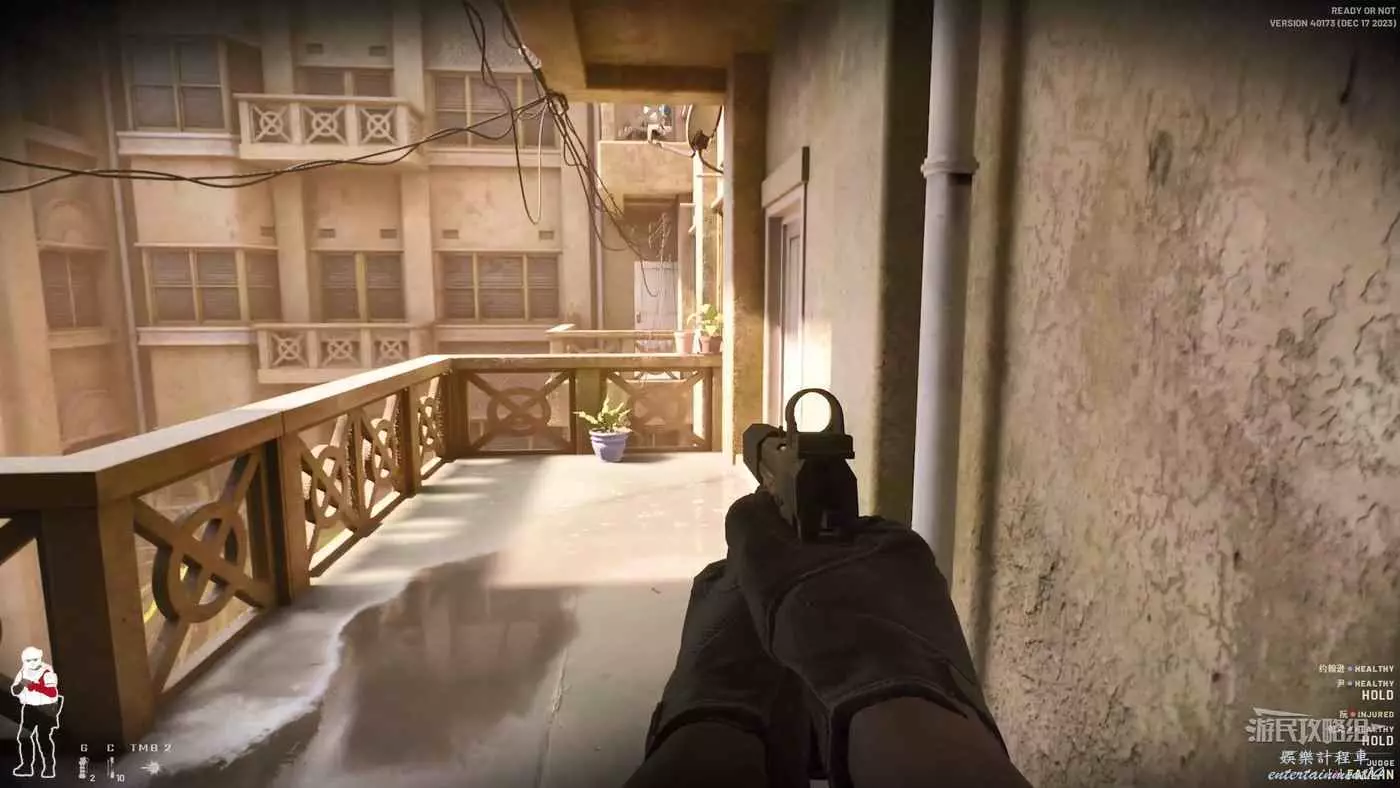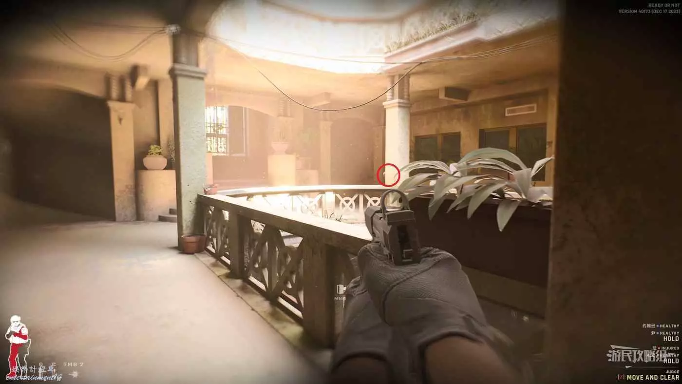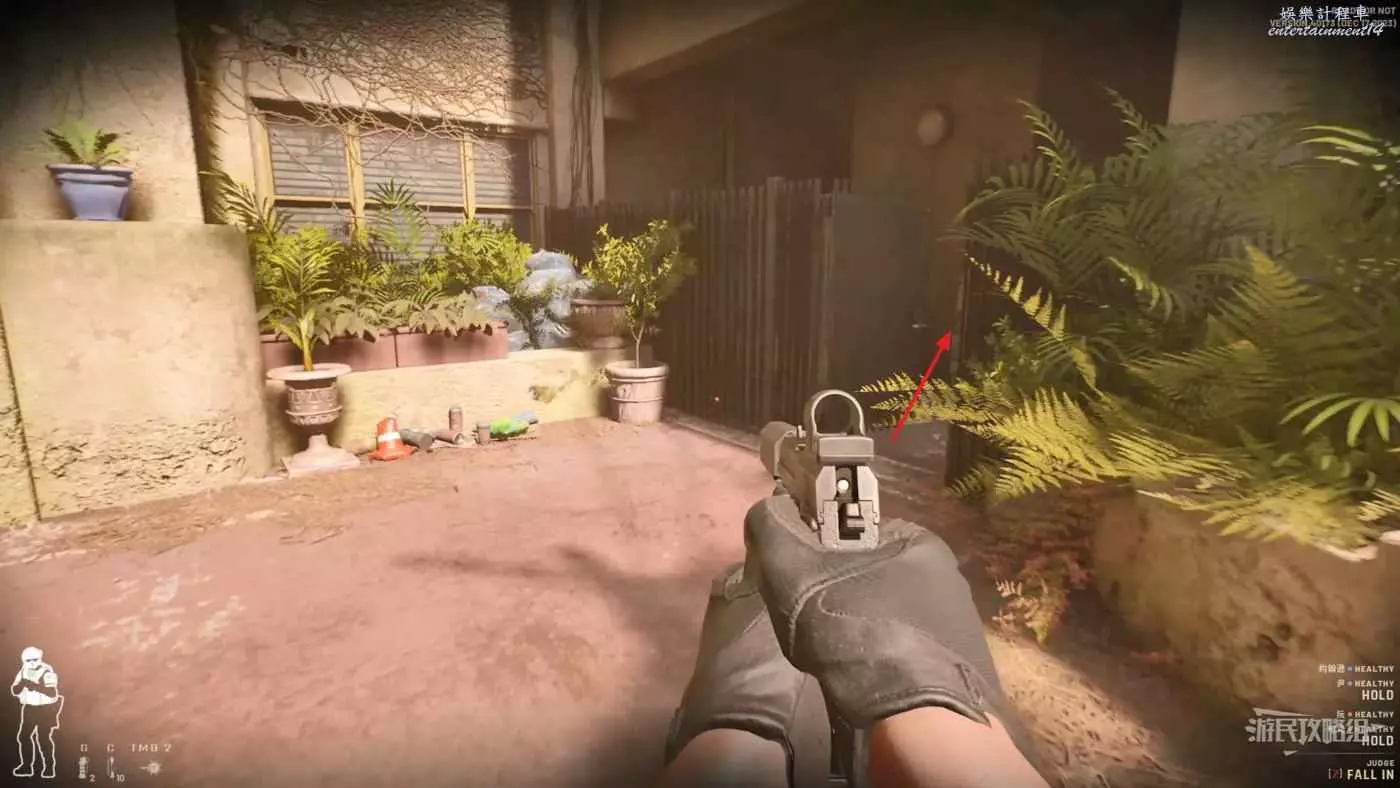 在起始處首先爬上樓梯,往右邊的小房子走,這裡很高幾率會刷出一個人質或者敵人,如果直接爬上左側樓梯就會錯過導致後面找很久。