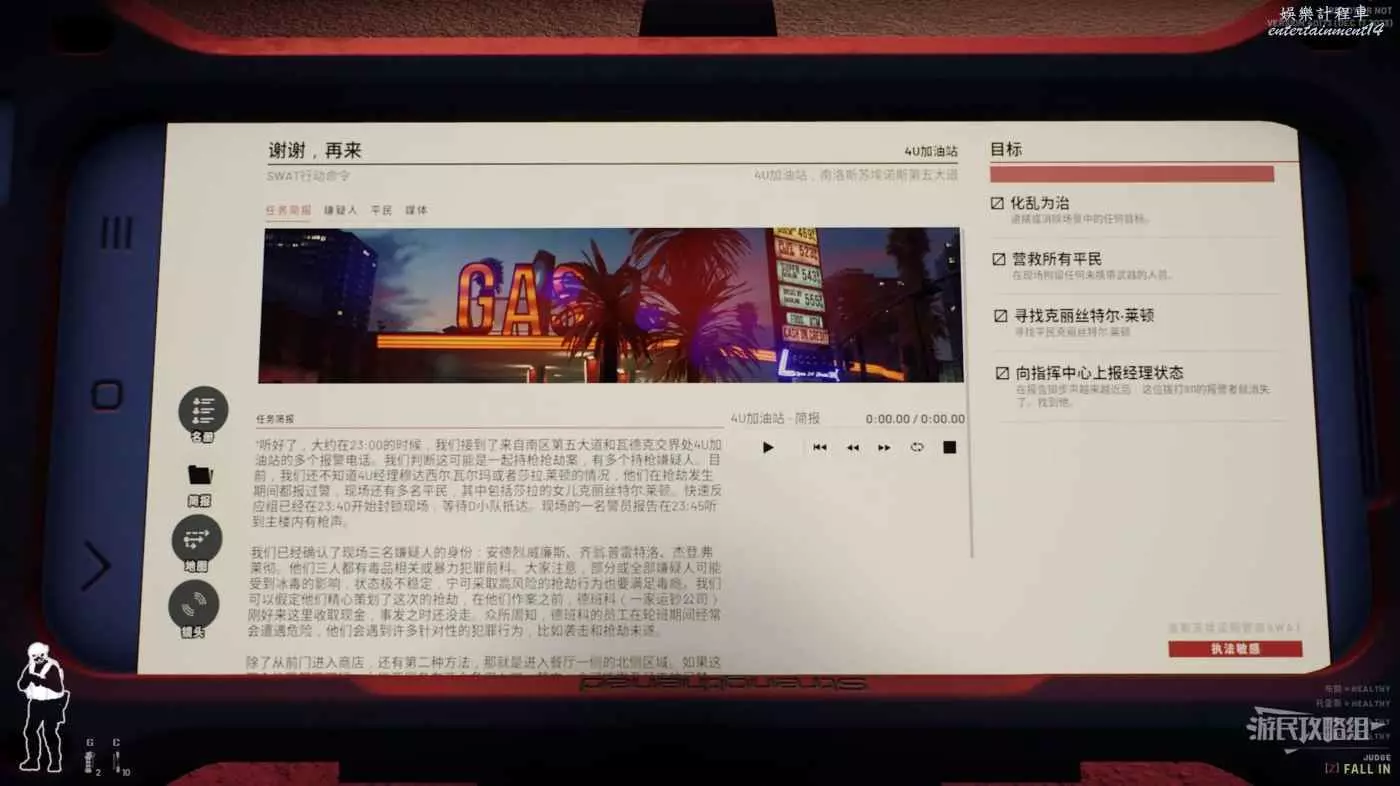 4U加油站地圖有3個需要我們完成的目標,分別是找到克麗斯特爾-萊頓與經理,除了這倆人在餐廳處還有一個可以互動的老警員,最後救出所有平民並逮捕與清除所有敵人即可。