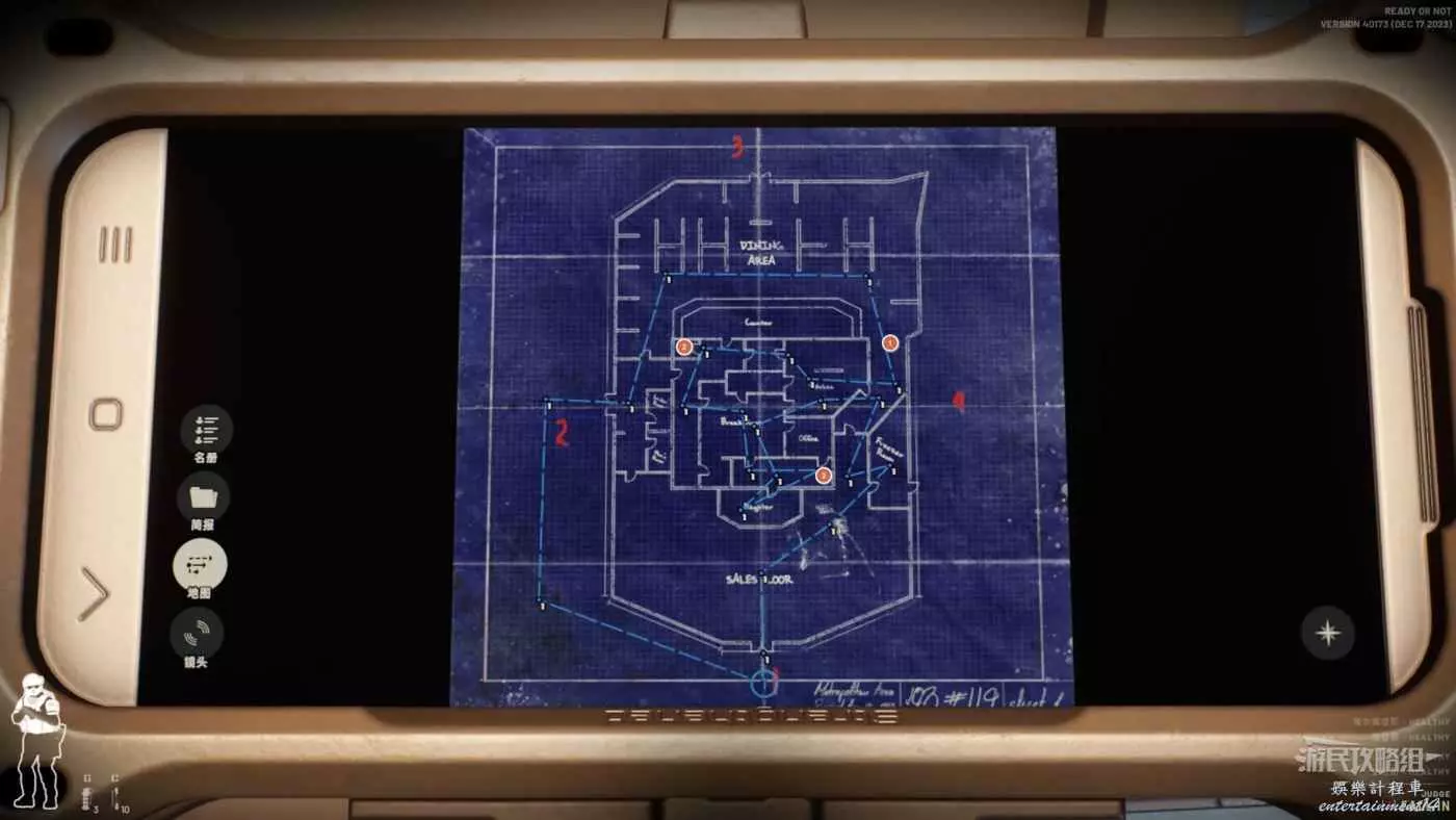 將任務目標理清,本次任務的行動路線如下,三個重要人物的位置也已經標註,數字1為老警員的位置,數字2為克麗斯特爾-萊頓的位置,數字3為經理的位置。