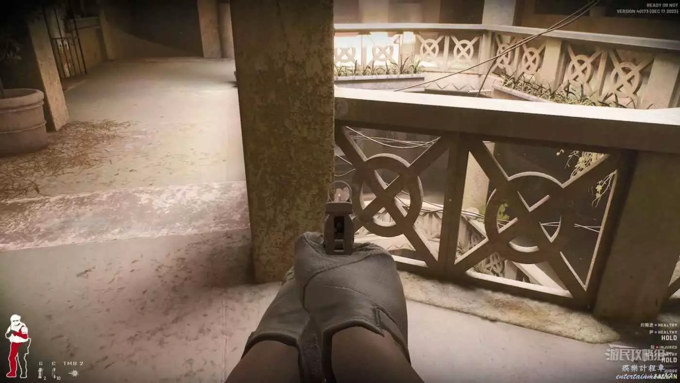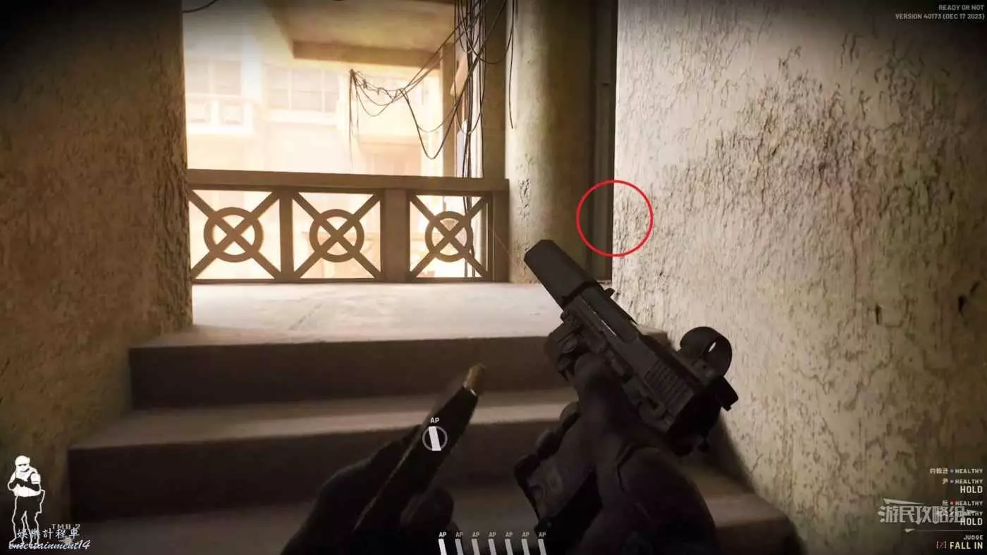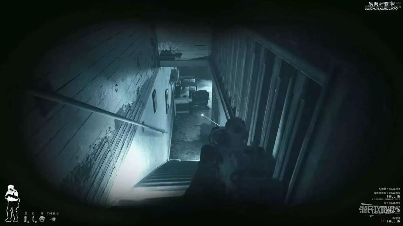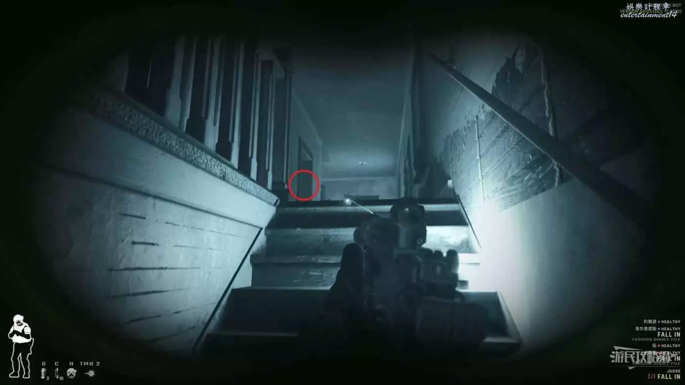 上樓梯中優先查看前方的安全與否,左側的扶手有木板擋著所以不用擔心會被左側的敵人攻擊,但也會出現意外情況。