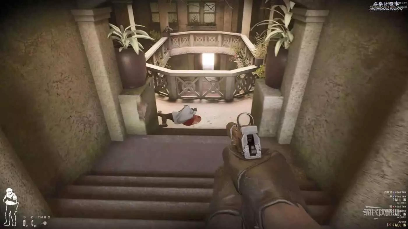 確認第三層沒有敵人後,慢慢靠近扶手處,通過扶手的鏤空位置尋找二層的敵人並擊斃。