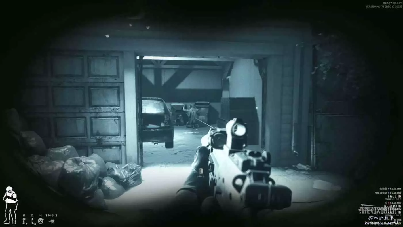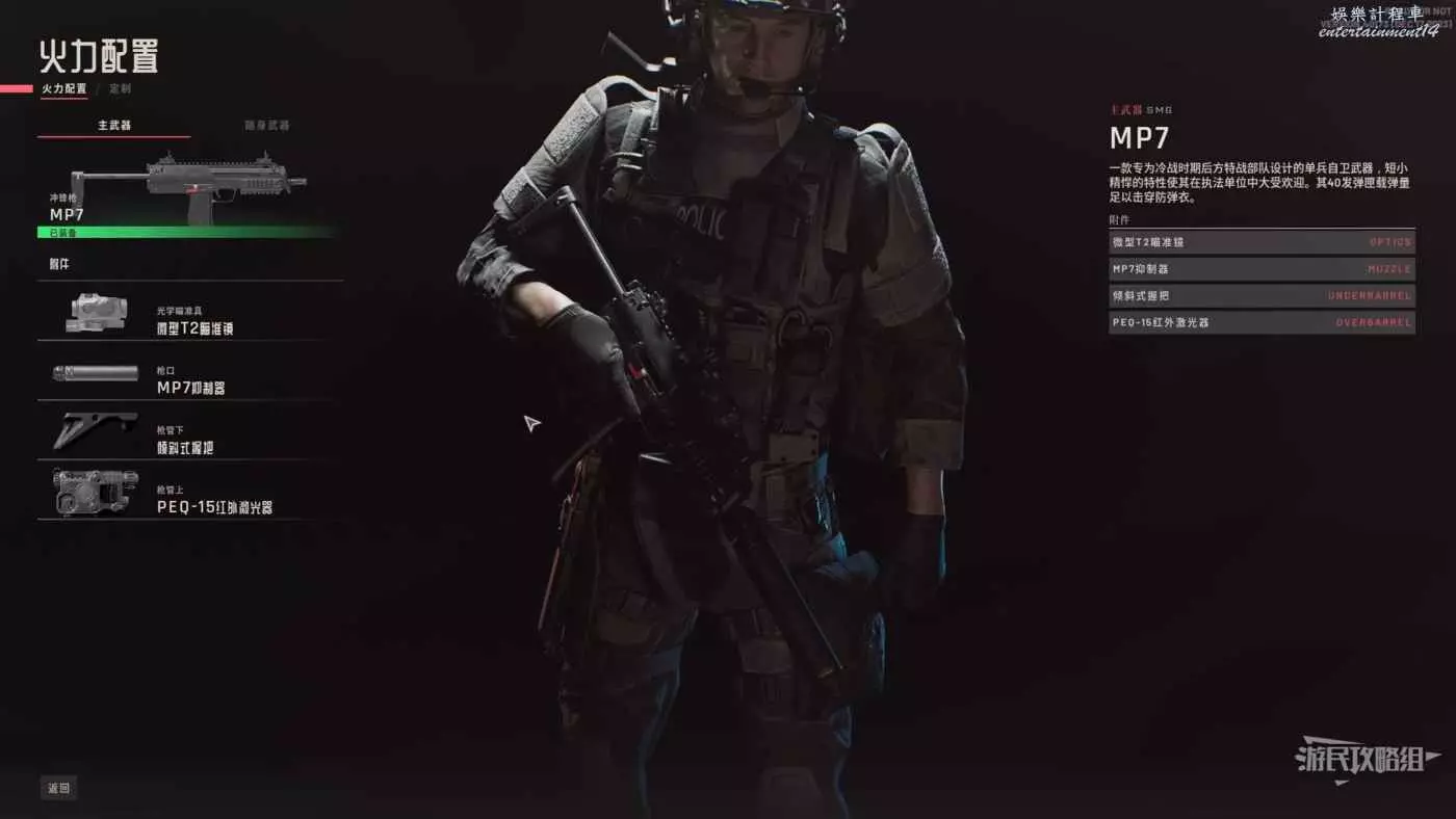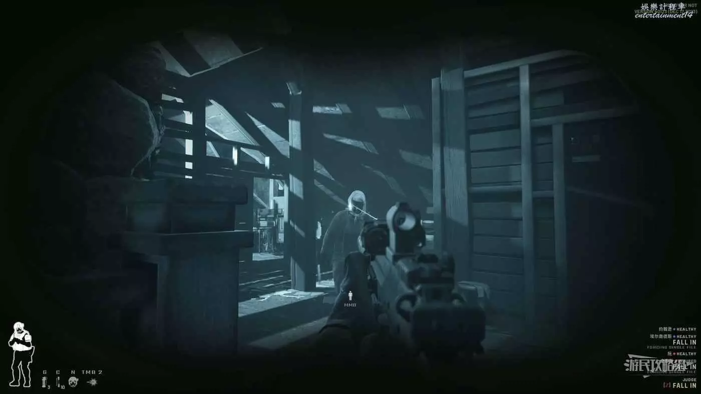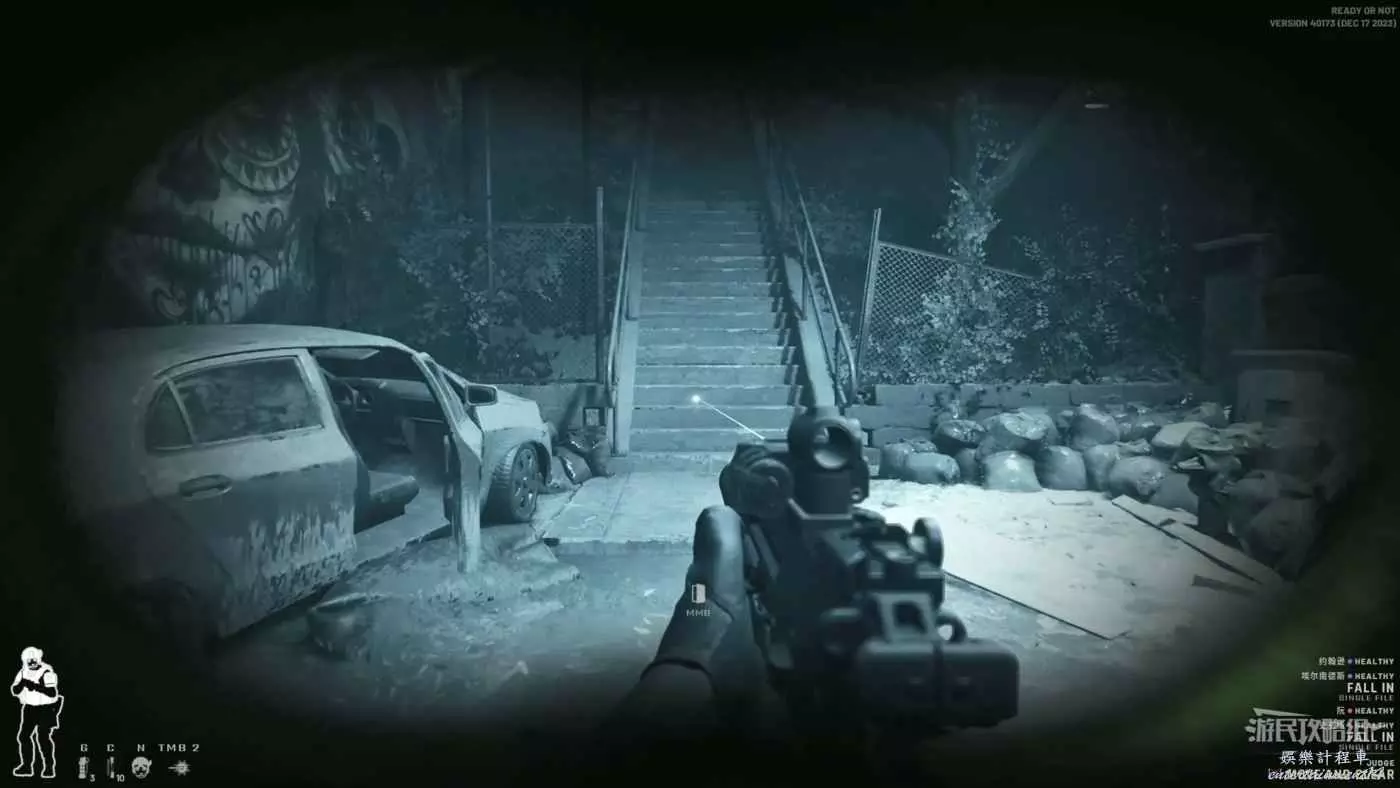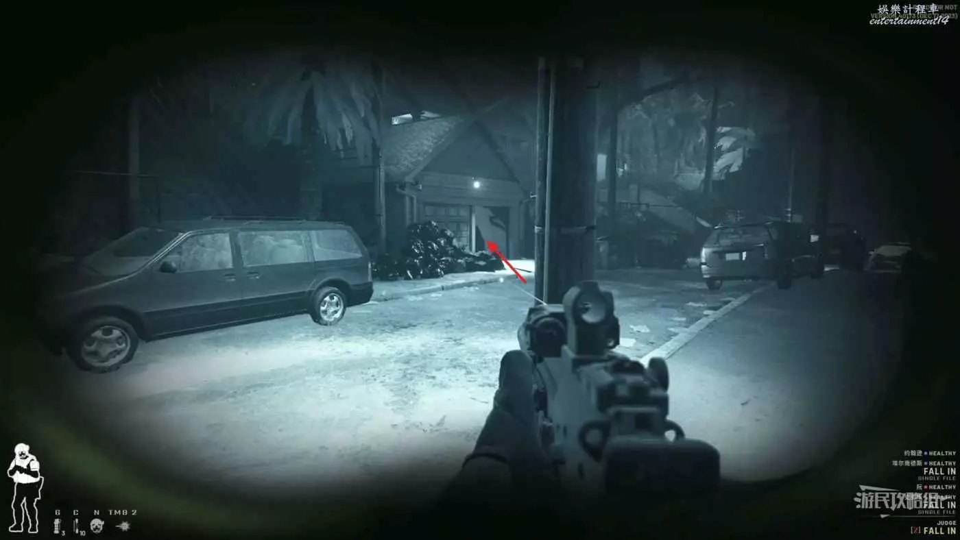 此地圖是夜晚場景,建議攜帶裝備陸用全視角夜視儀並將槍械的鐳射改為紅外鐳射。