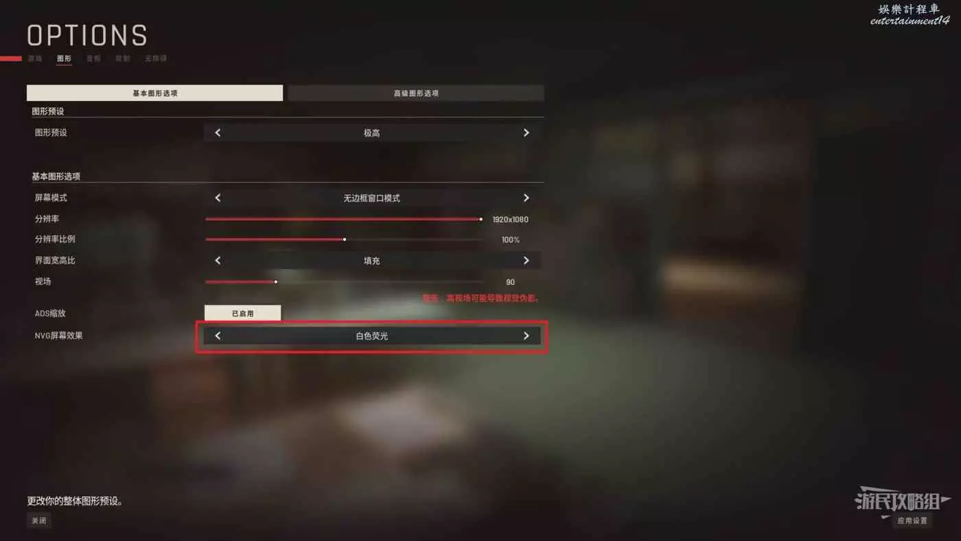 如果想要更改夜視儀的顏色需要再設置中選擇圖形,在NVG螢幕效果選項選擇白色螢光即可。