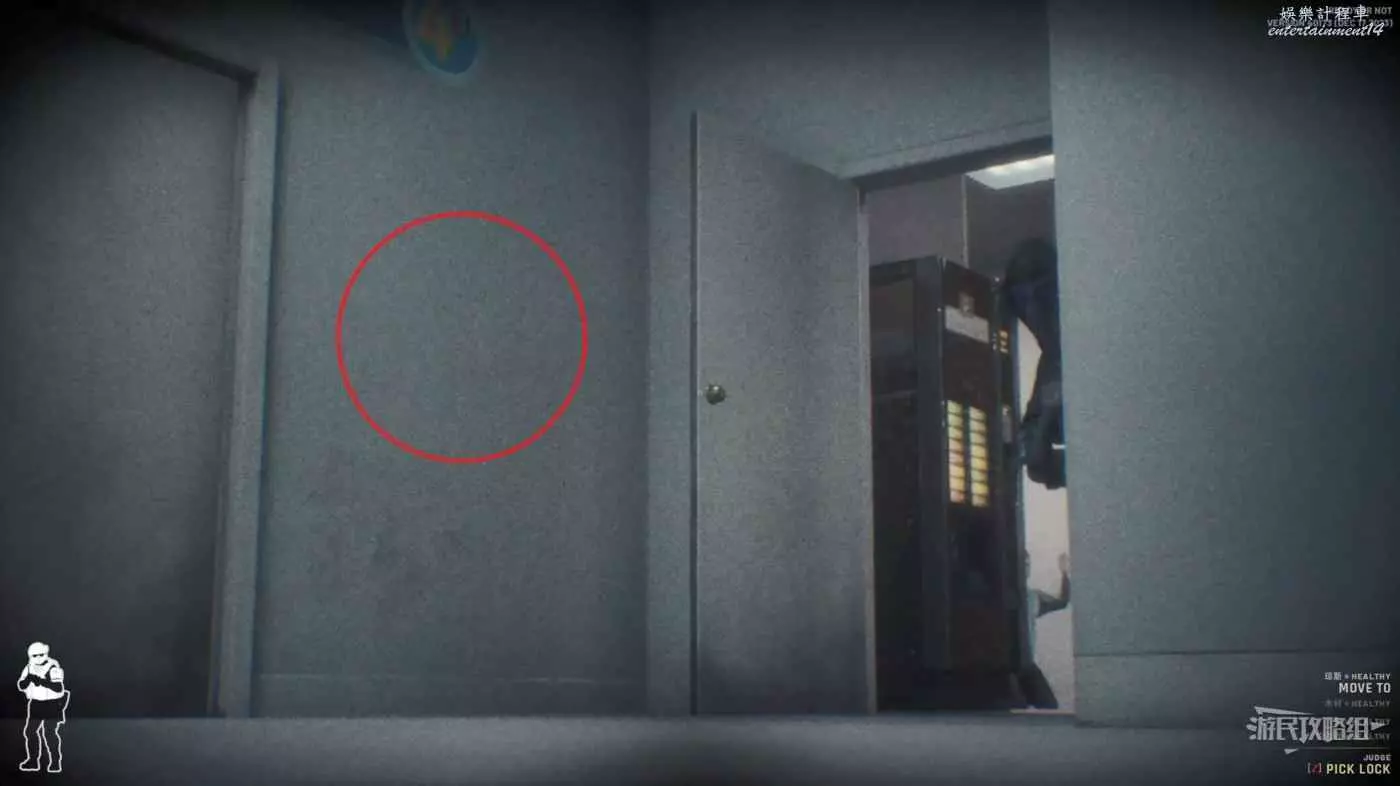 隨後找到第三層畫滿小人的門處,邁克爾就位於此處,使用鏡槍查看裡面的情況。
