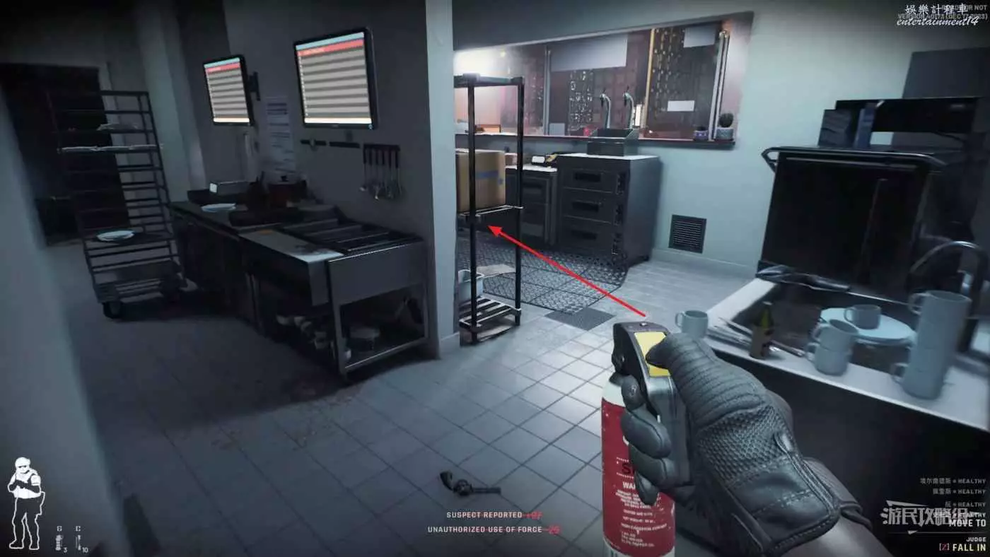 將此人逮捕後打開左邊通往餐廳的門,按照原定路線開始打掃餐廳的敵人,因為此處刷出敵人的幾率很大且數量不少,放著不管後面容易偷屁股,所以優先清掃這裡。