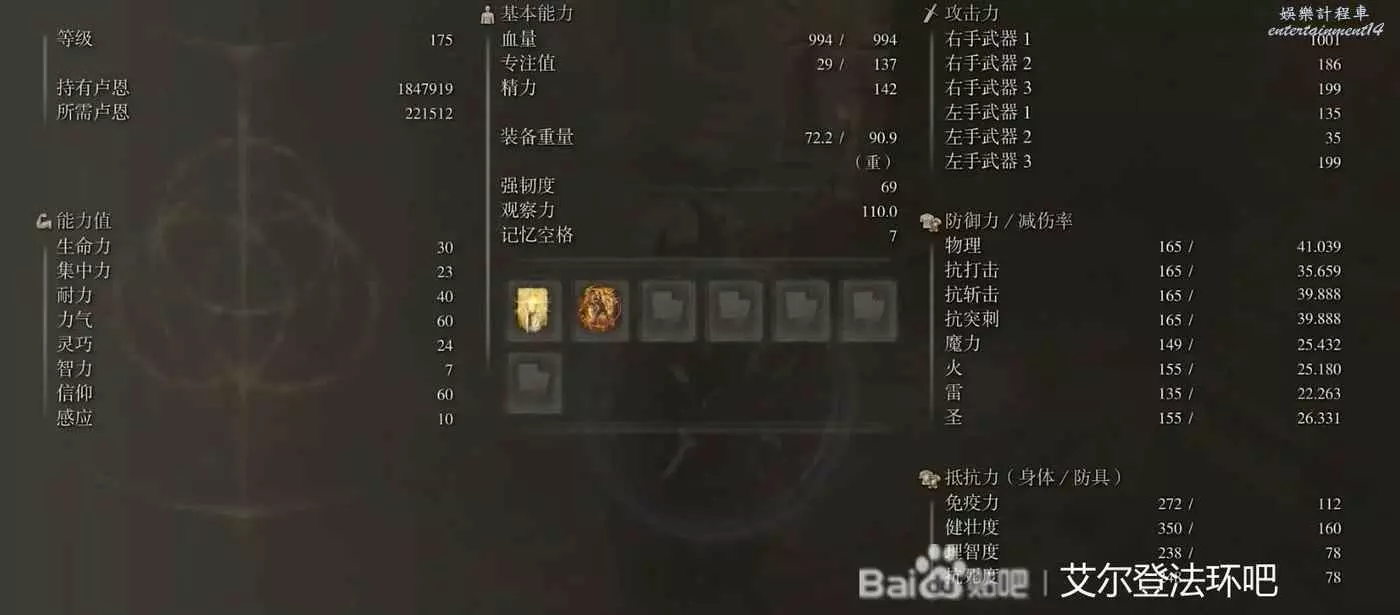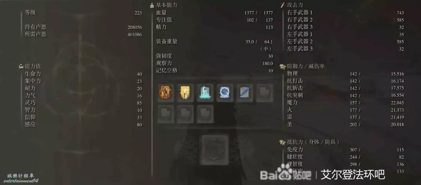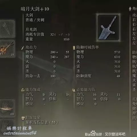 然後等娶老婆了就洗點,拿暗月大劍+水母盾,配合大哥嘎嘎亂殺,信仰點夠黃金樹,力氣點15配合達拉崗夠拿水母盾就行,不加藍,加點血量耐力,剩下的猛戳智力,還可以客串亞茲樂秒精英怪。