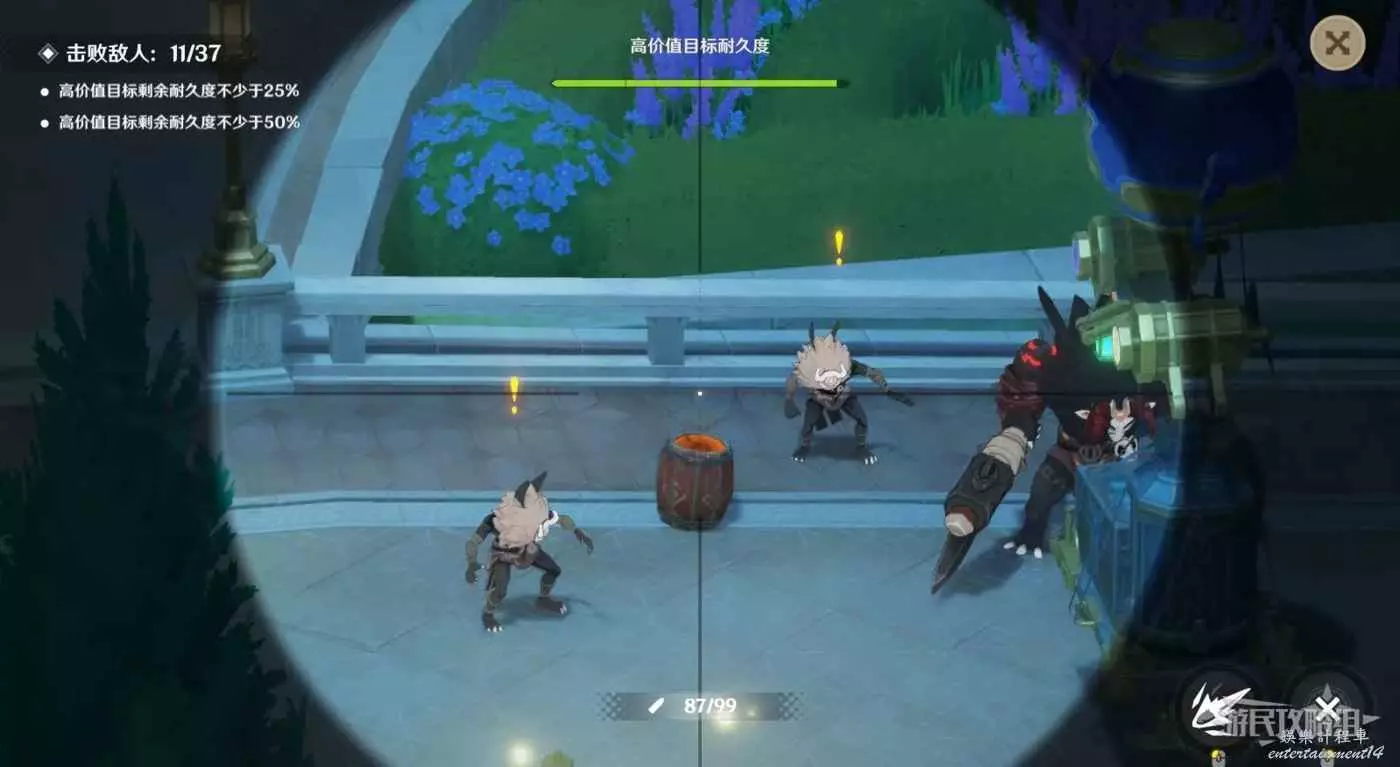 擊殺完畢後就會出現本關第一隻丘丘暴徒,暴徒需要兩發子彈才能擊殺,但後續出現的敵人旁邊會同時出現一隻爆炸桶,敵人出現後會停在爆炸桶旁邊幾秒,可以抓住這段時間立即射擊將周圍所有敵人清掉,如果錯過了也沒關係,先打炸藥桶再補漏即可。