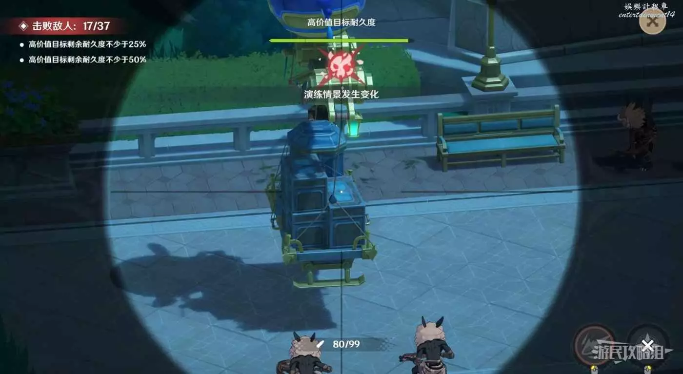 本關需要保護貨運氣球,所以優先攻擊射手和靠近氣球的敵人。演練場景會發生多次變化,注意觀察附近出現的爆炸桶,有爆炸桶出現時優先射擊爆炸桶,爆炸桶不會對氣球造成傷害。
