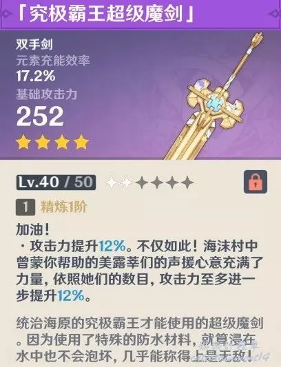「究極霸王超級魔劍」外觀畢業,適合0命娜維婭,但不如「螭骨劍」(大月卡武器),當然「裁斷」(專武)更好,若聖遺物暴擊詞條足夠多,也可帶「狼末」(常駐武器)