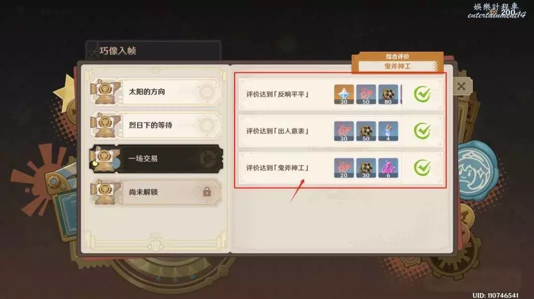 ◆ 評價達到「鬼斧神工」可獲得20劇戲票券+30逸趣映片+6個精鍛用魔礦。