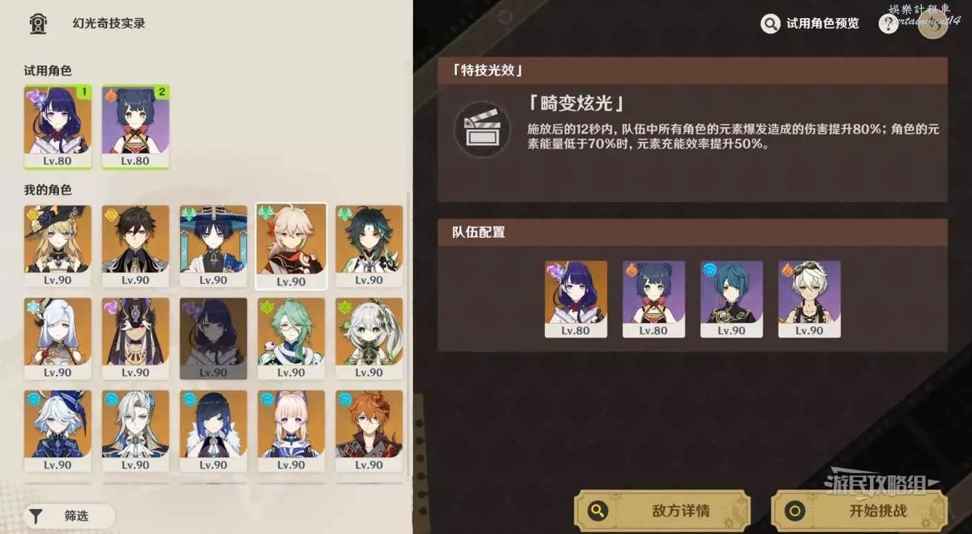 本關的增益效果是元素爆發的增傷和迴圈率提升,因此建議圍繞能夠打出高額元素爆發的主C來搭配陣容,試用的雷電將軍元素爆發傷害很高,也能為隊友提供增傷,推薦選擇。