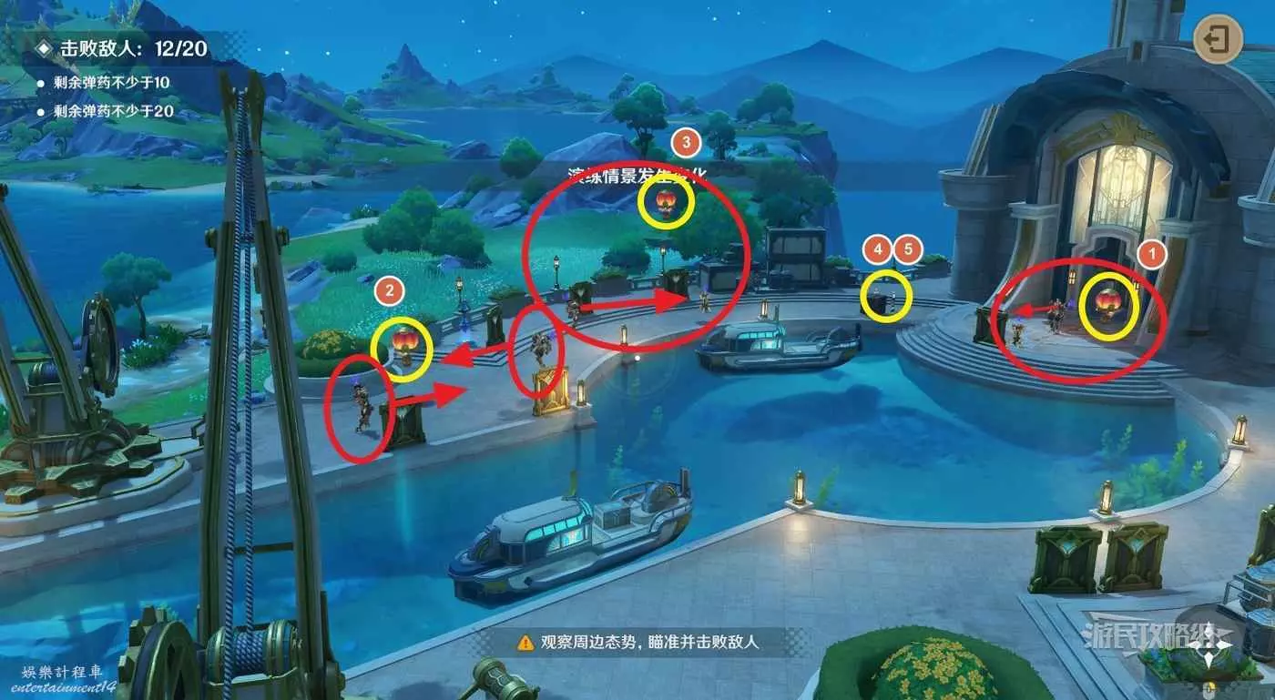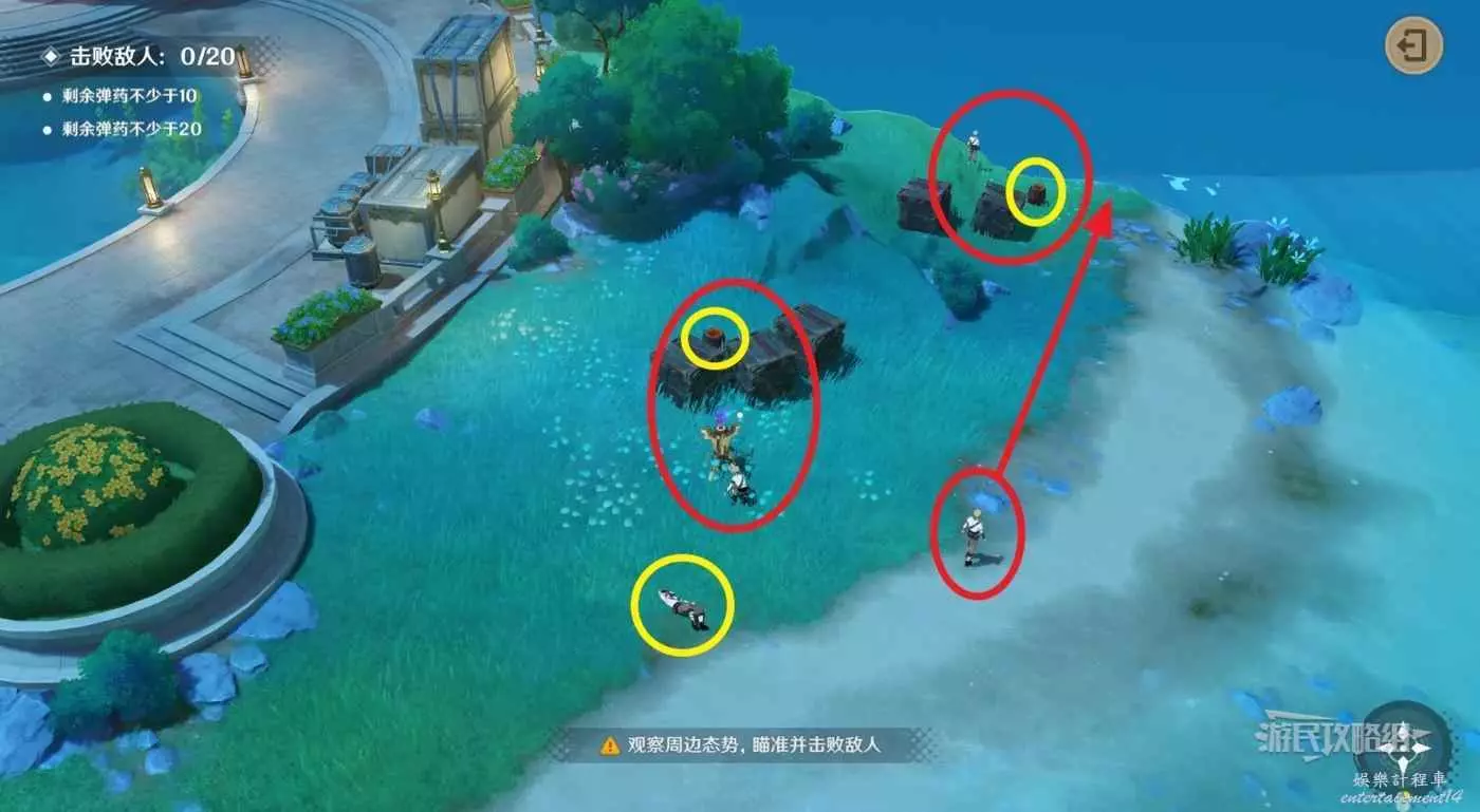 第一波敵人參考下圖,射擊黃圈位置即可。岸邊的炸藥桶,等右下方路上的敵人走到旁邊再射擊,可以一次消滅兩名敵人。