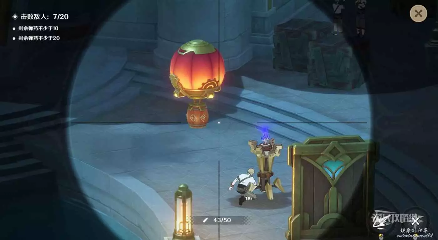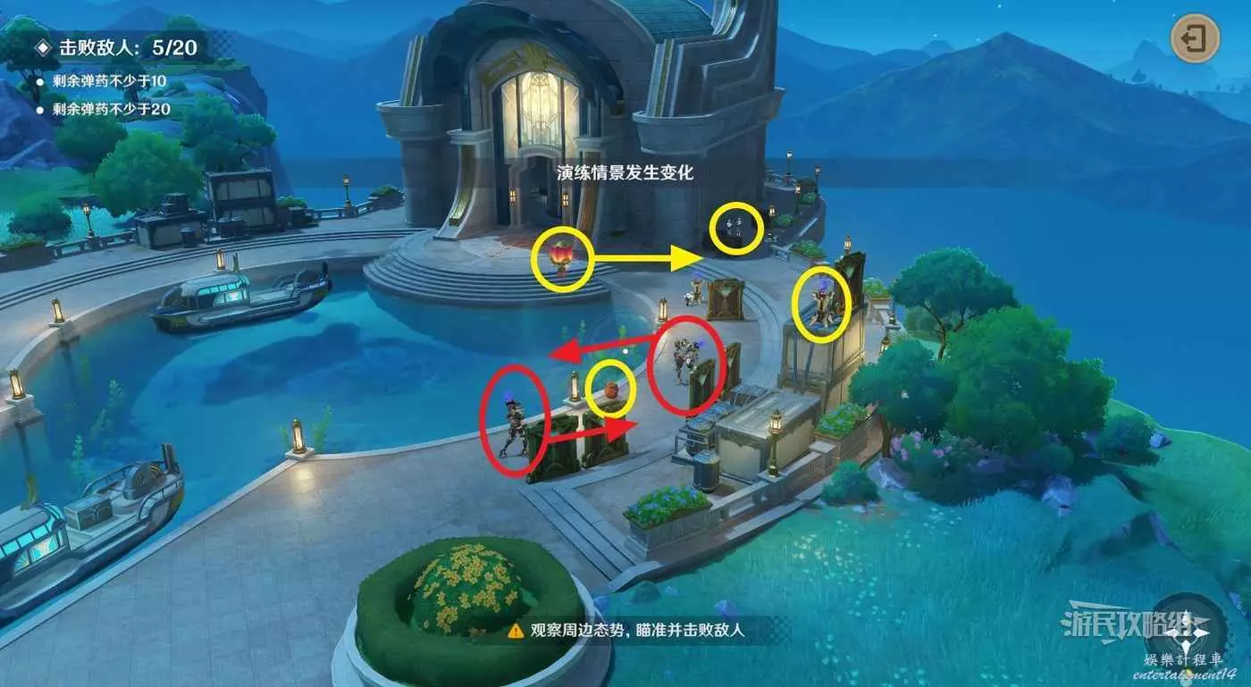 然後情景發生變化,第二波敵人出現的同時會出現巡航藥桶,等藥桶移動到合適位置再射擊即可。參考下圖位置,黃圈為需要射擊的目標。