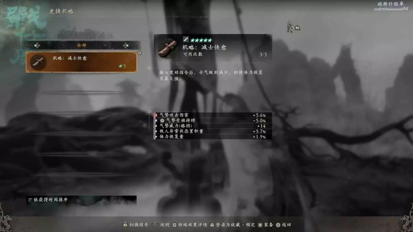 最後就是加入了新系統機略:可以在牙旗那裡裝備最多兩個機略,最多包含5個詞條,除外附帶一個主動技能——比如通關後徐庶送的那個減士快愈效果就是降低士氣等級但是回滿血。由於這個系統同樣也是通關後開放,在DLC3攻關過程中沒有獲得,不太清楚其他機略需要什麼條件刷出來,以及是什麼效果。