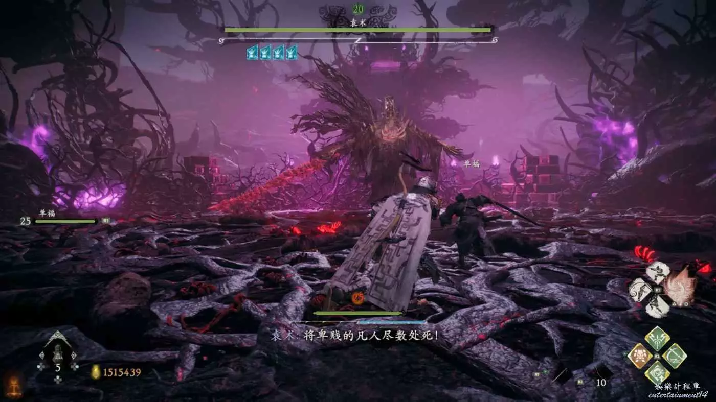 樹妖毒屬性傷害,但整體上算比較大型的怪,加上非常弱火,整體上感覺不如流程中的精英怪放電的脹鬼;徐庶飛來飛去用劍氣攻擊,感覺難點大概在於紅光不多,不容易化勁打處決,不過多跑動、防禦和蹭刀,也不算難打;袁術的話分為P1和P2,P1連刀很容易連續化勁,打出處決賊快,感覺基本是白給,但是P2各種飛來飛去、大範圍傷害、加上全屬性抗性,基本就是DLC2的太史慈噩夢重演……