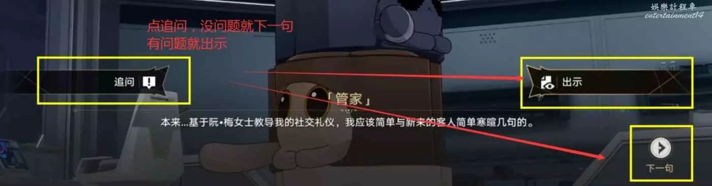 收集完線索,就可以找管家辯論了,辯論中,我們不需要去看他說了啥,我們只需要點追問。當追問中出現黃色字,就代表可以拿證據了。