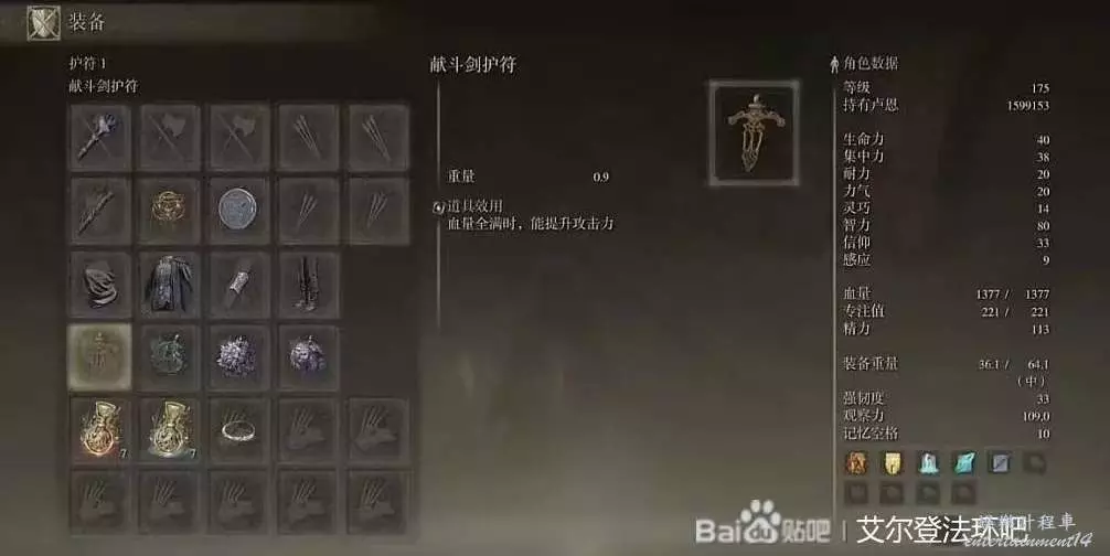 智信雙80加點,除了施法觸媒換用死王子杖獲得更高的法術傷害外,其餘加點配裝和之前相同,但是在此加點下,除了使用法術之外,我們同樣可以使用各種禱告來進行輸出,我們選用黃金律法聖印記作為施法觸媒,副手直接使用水母盾增傷,護符使用獻鬥劍+群聚信徒立誓步+火/雷對蠍最後一個位置和法術類似根據禱告是否可以蓄力,選用葛孚雷雕像或者信徒立誓布,龍饗類禱告選擇咆哮墜鏈。