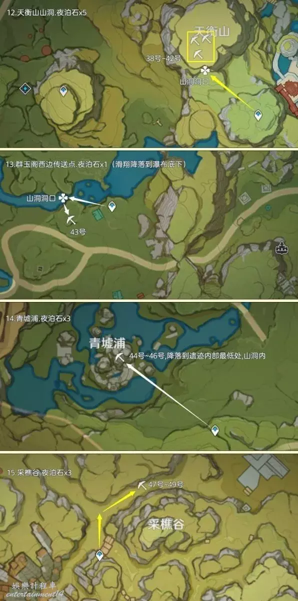 夜泊石點位僅分佈在璃月地區內(包含地下礦區),其中可採集數量為73個,製作路線時儘量遵循從上往下游,視野高好看清,方便旅行者探索