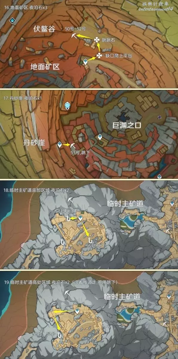 2.關於標記:魚鉤標記/礦物標記均為夜泊石,四葉印標記為洞口/分支路線/傳送門等,方便尋路
