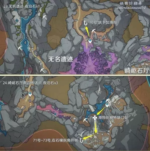 (22號~23號)瓊璣野七天神像傳送點,往北方向跳下,滑翔到下方池塘中,之後往南方向視角看有個洞口,裡面有2個夜泊石