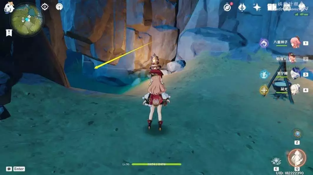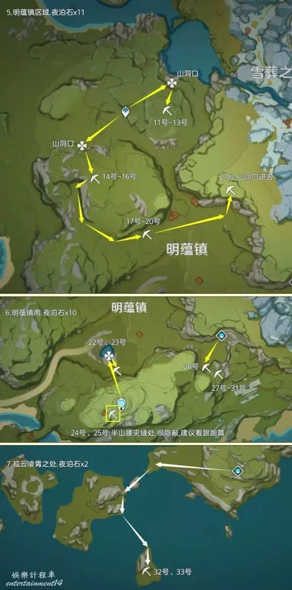 (11號~13號)明蘊鎮北邊傳送點,轉東北方向視角一直衝刺到懸崖邊,之後跳下回頭看,會有個山洞口
