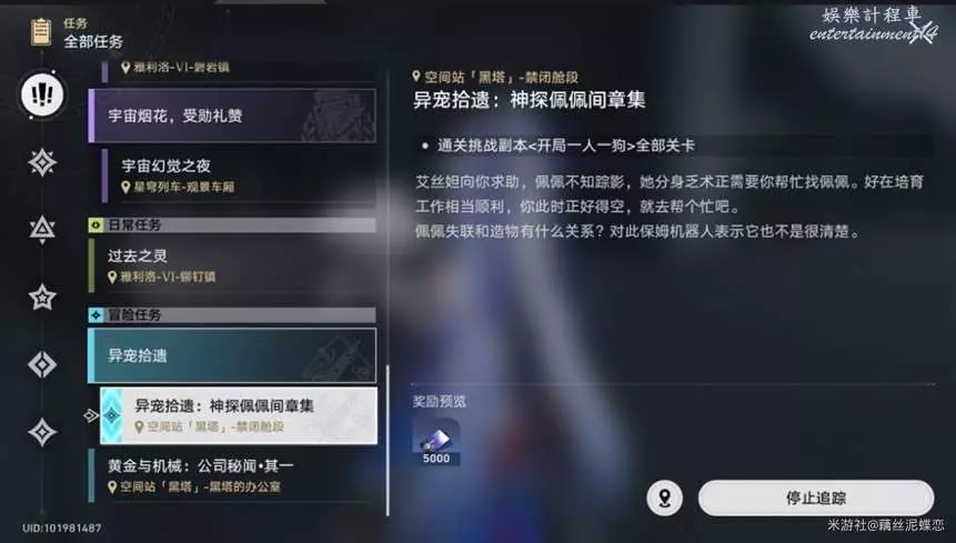 劇情背景:黑塔的奇物【分裝快樂】被偷了,好像和阮·梅的造物有關,艾絲妲派佩佩去找,但是佩佩也失蹤了,於是乎艾絲妲找到了開拓者幫忙。