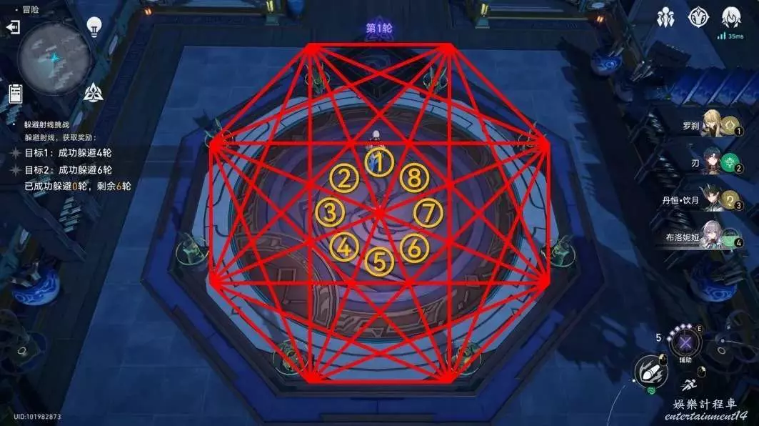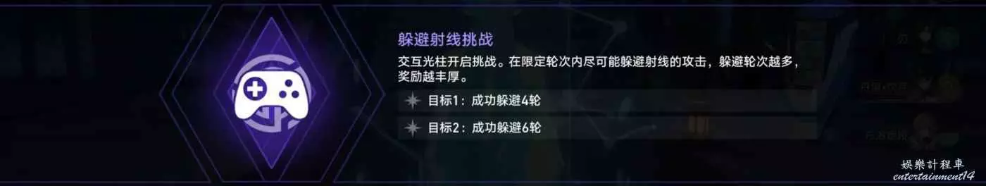 在正八邊形的場地內,每輪會發射隨機的射線,躲避達到一定輪數可以獲得獎勵。