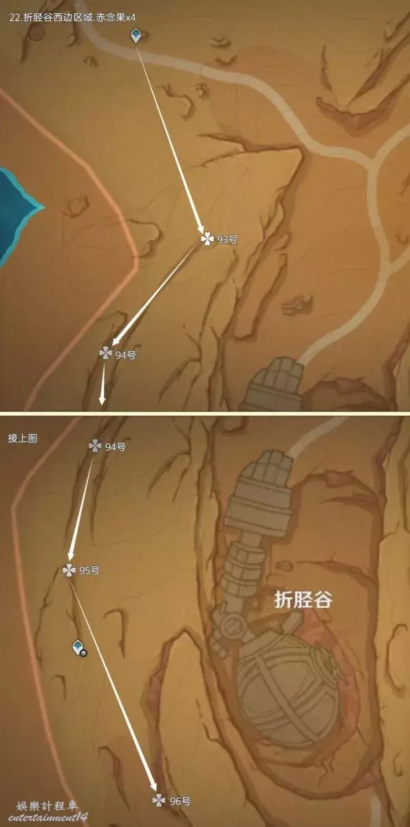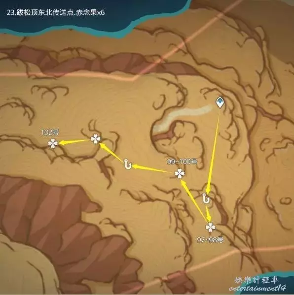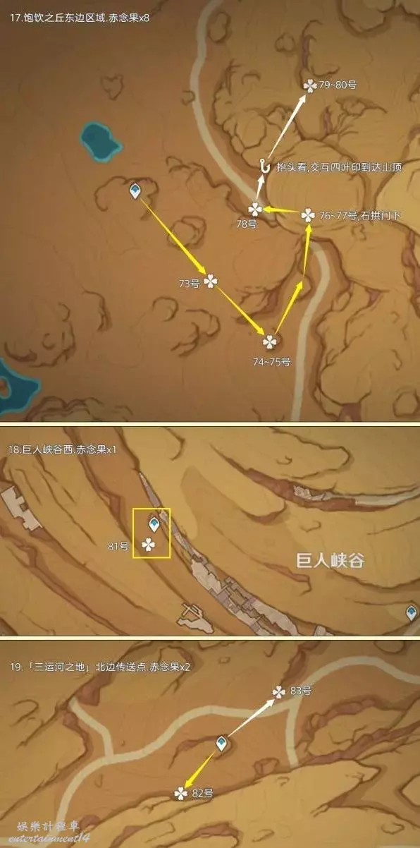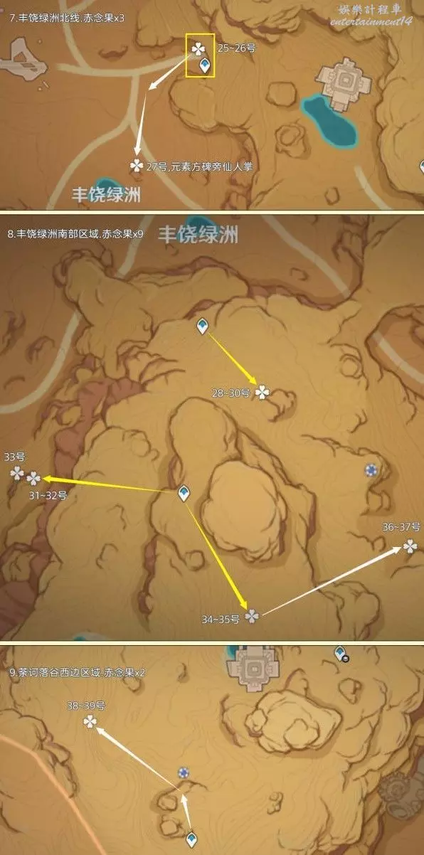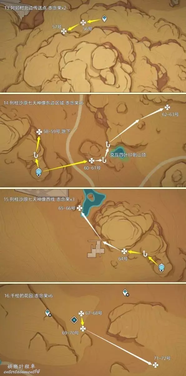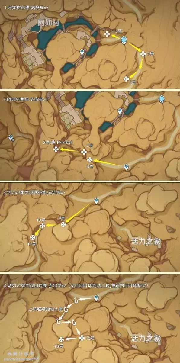 赤念果點位僅分佈在須彌沙漠地區內,其中可採集數量為102個,製作路線時儘量遵循從上往下游,視野高好看清,方便旅行者探索。