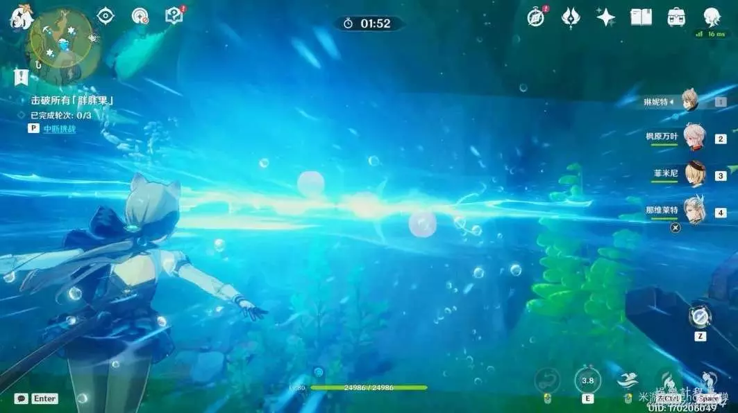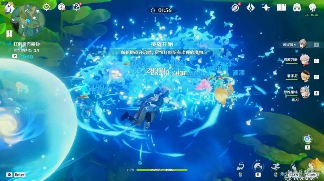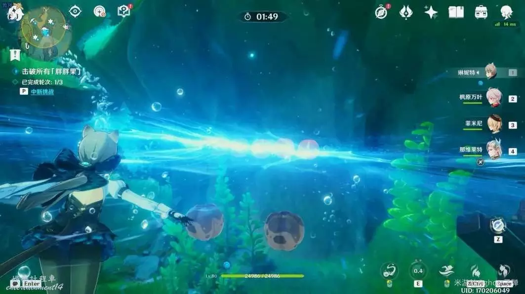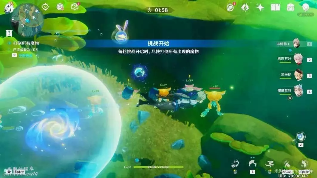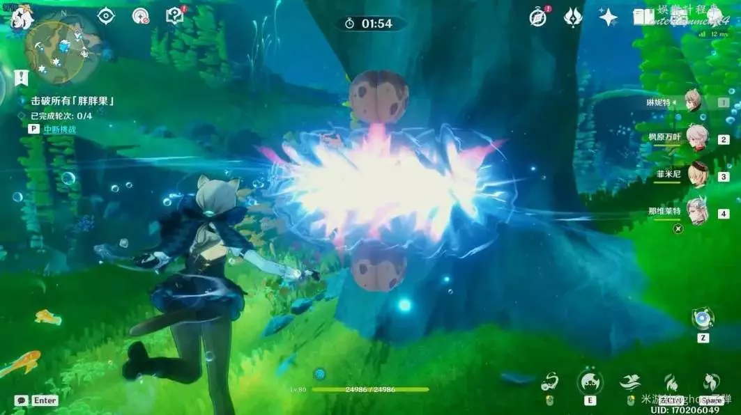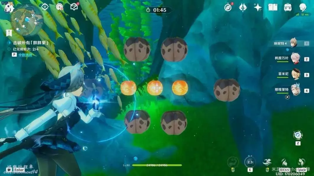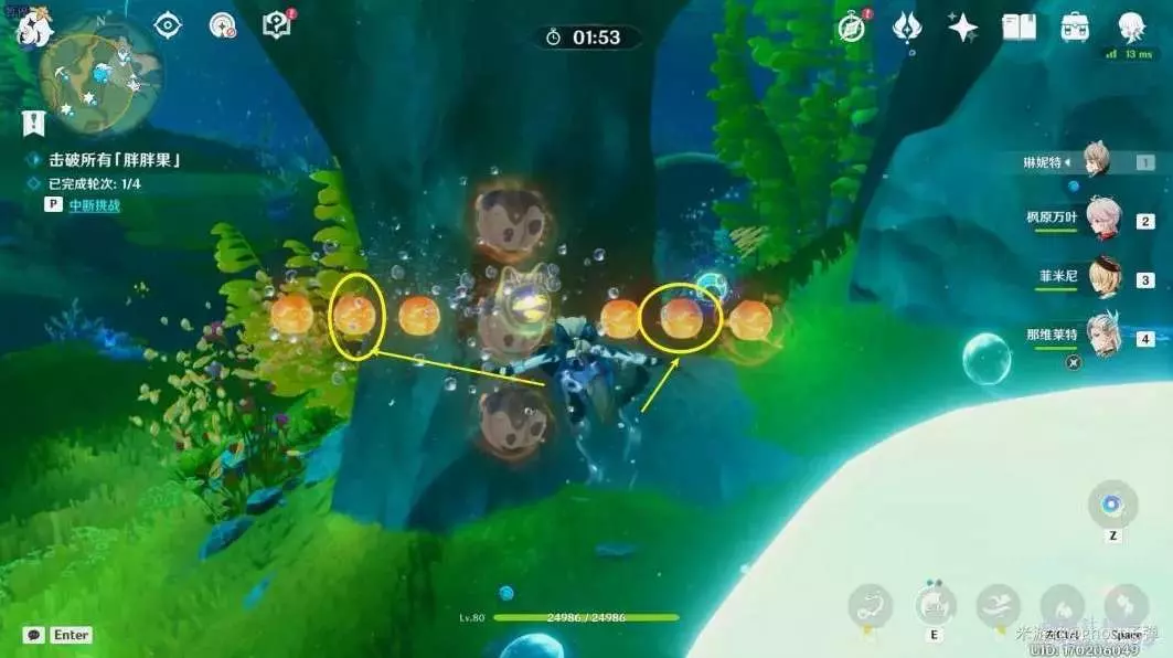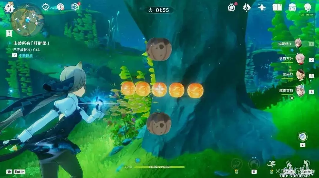 開啟挑戰,一共有4個波次的胖胖果需要擊破,目標選擇中間的胖胖果,長按E技能攻擊,4個波次都這樣。