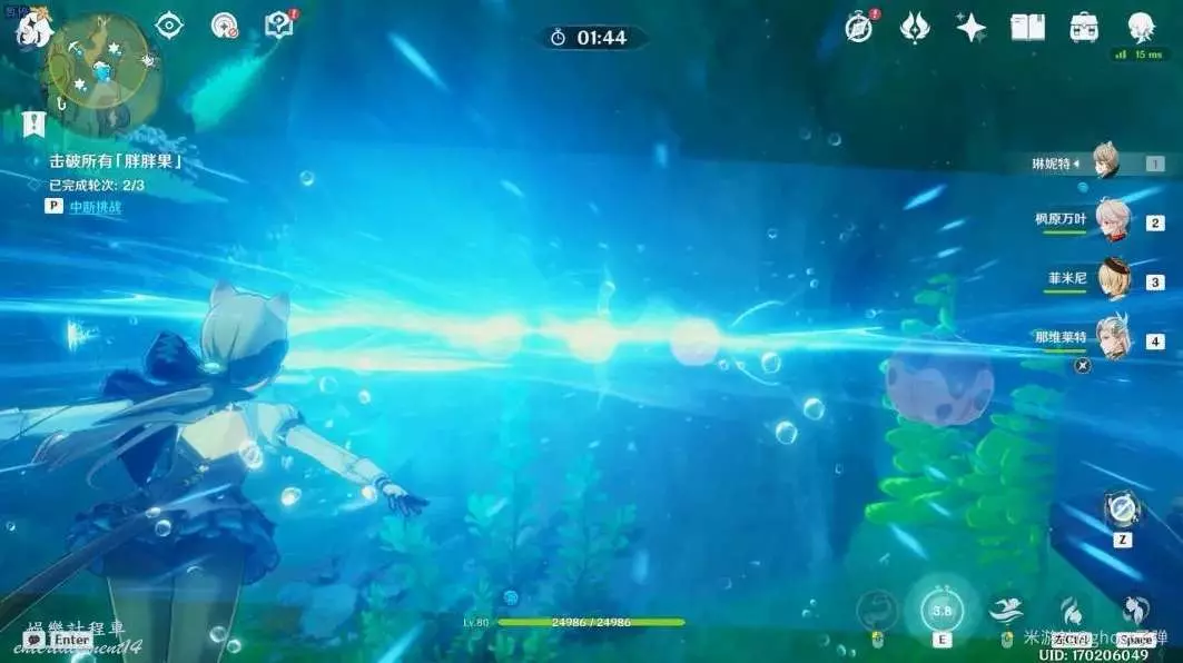 開啟挑戰,一共有3個波次的胖胖果需要擊破,目標選擇中間的胖胖果,長按E技能攻擊,3個波次都這樣。